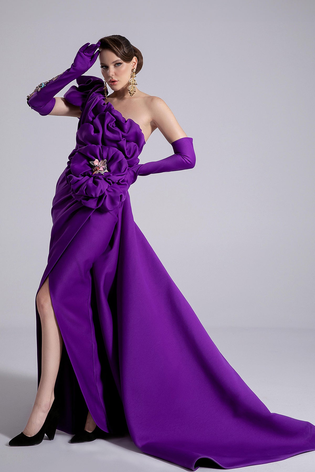 Purple one-shoulder long dress. Featuring a floor-length silhouette with a thigh-high side slit and ruffles are intricately layered to form organic petals and spirals.