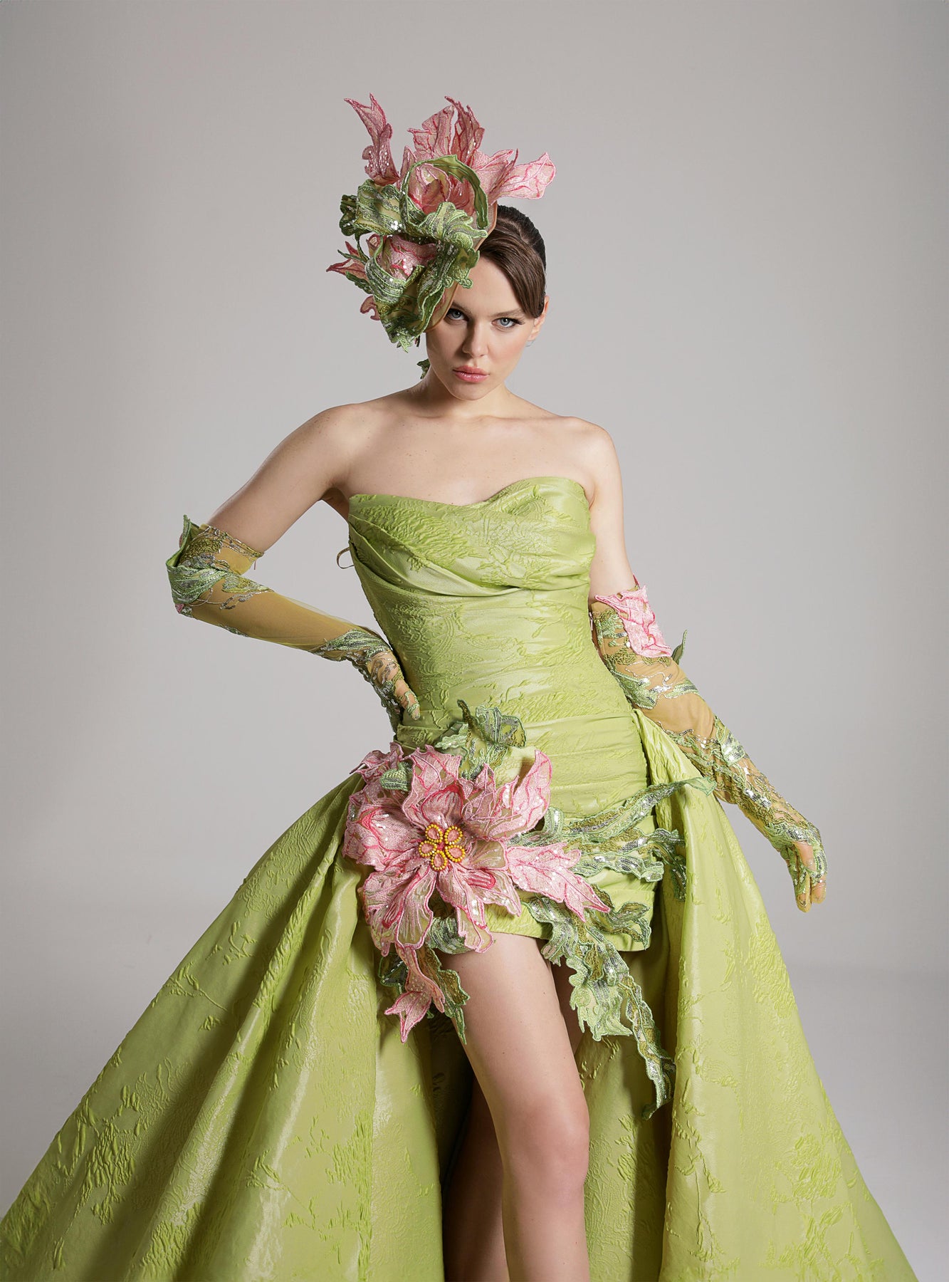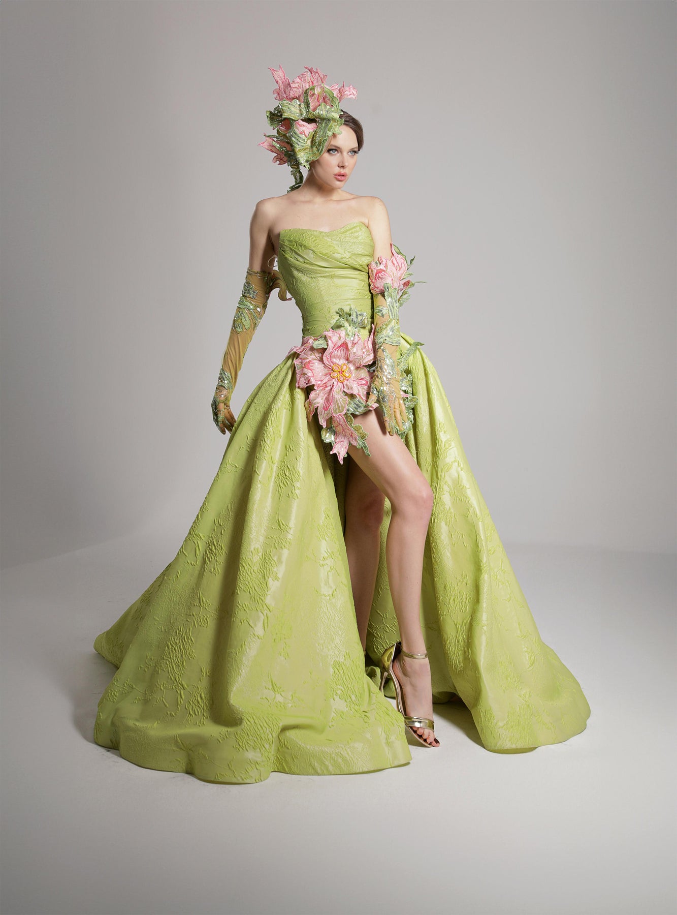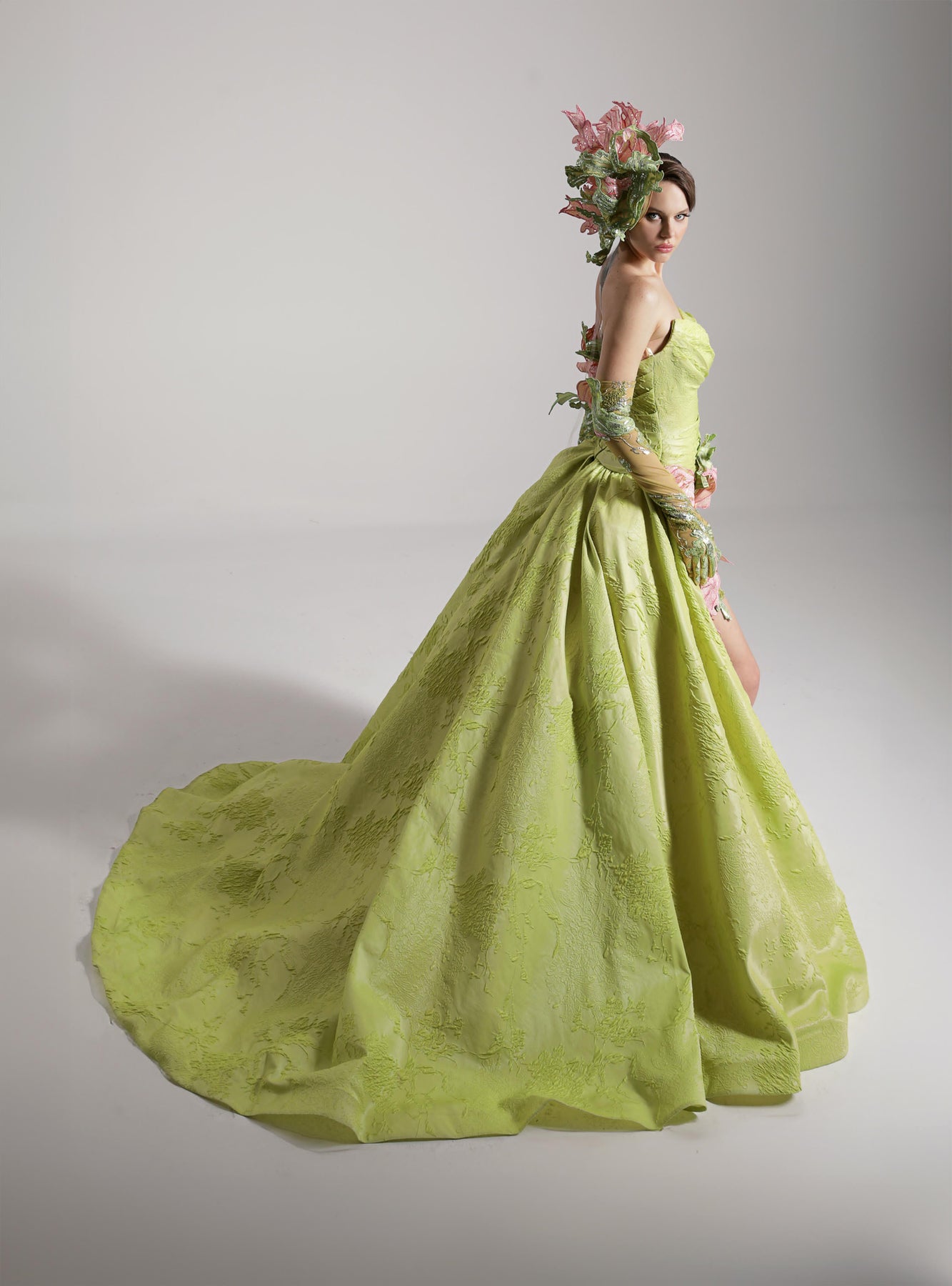 Lime green mermaid dress. Featuring a floor-length mermaid gown that crisply contours the torso and hips before blooming into a full, sculptural train. Complemented with an off-the-shoulder neckline that gracefully wraps the décolletage.