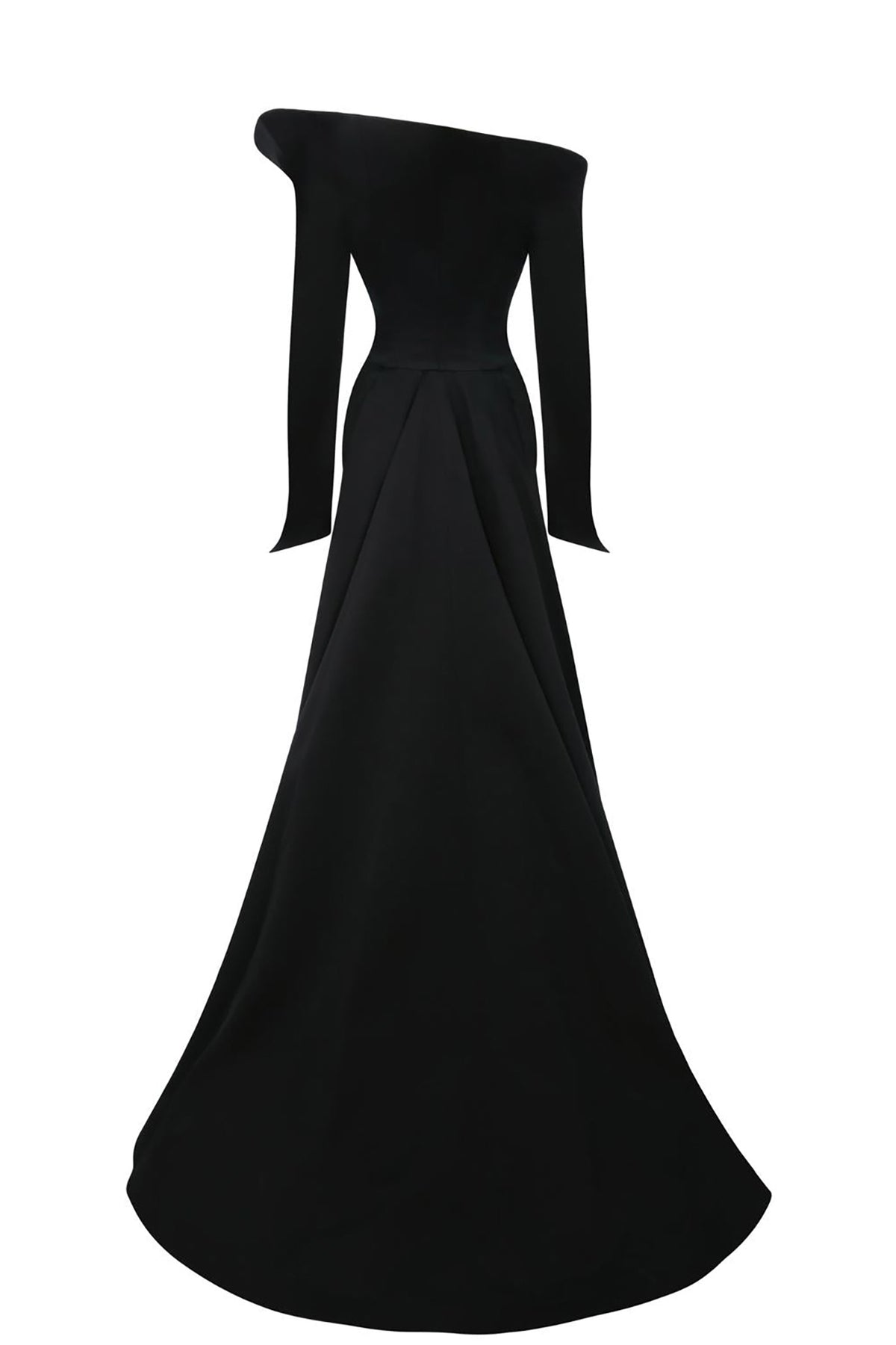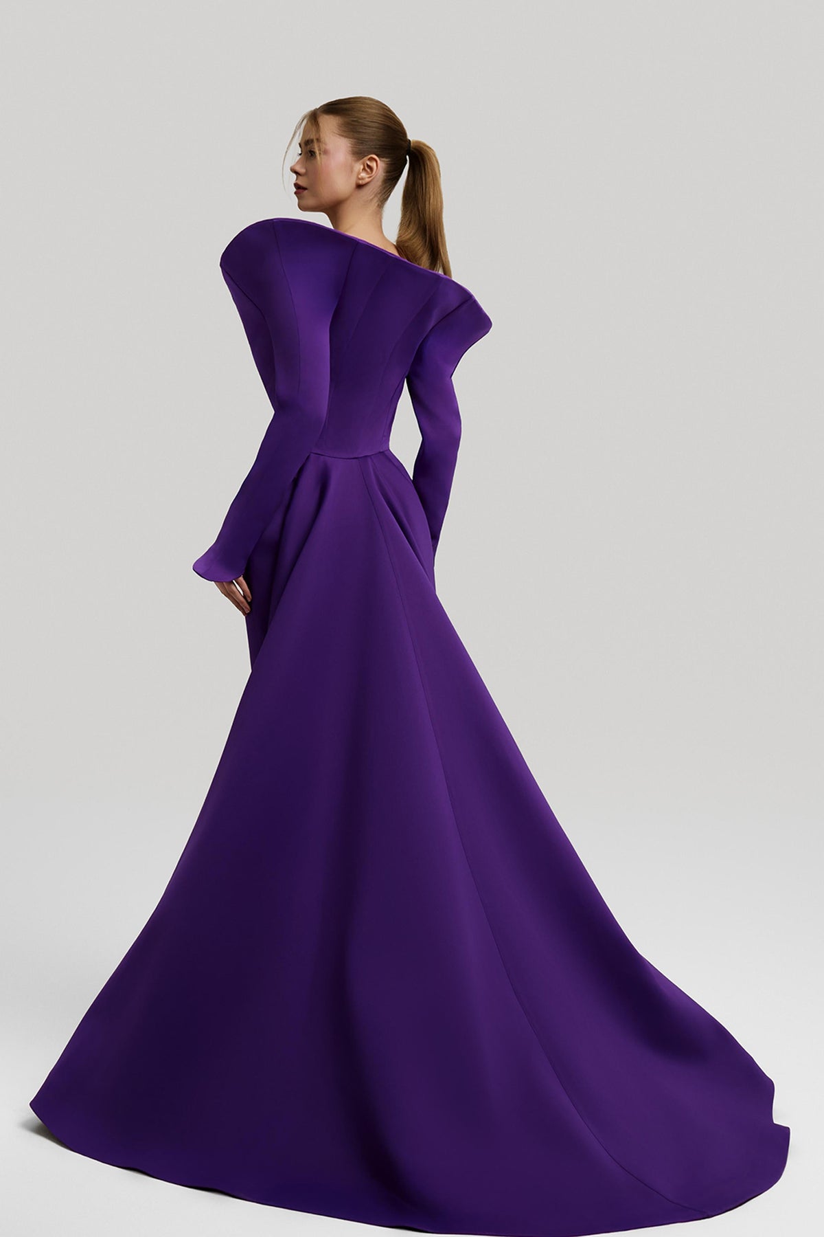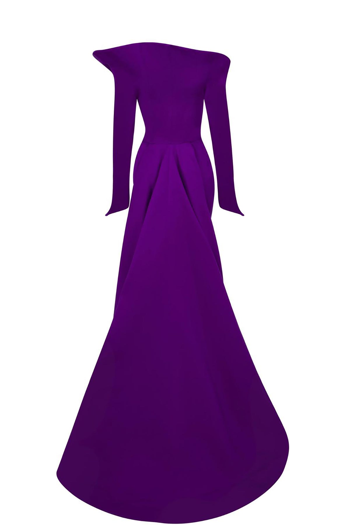 Purple floor-length crepe column-to-mermaid dress. Featuring an off-the-shoulder hybrid that drapes gracefully across the collarbone. Complemented with long fitted sleeves along the arm.