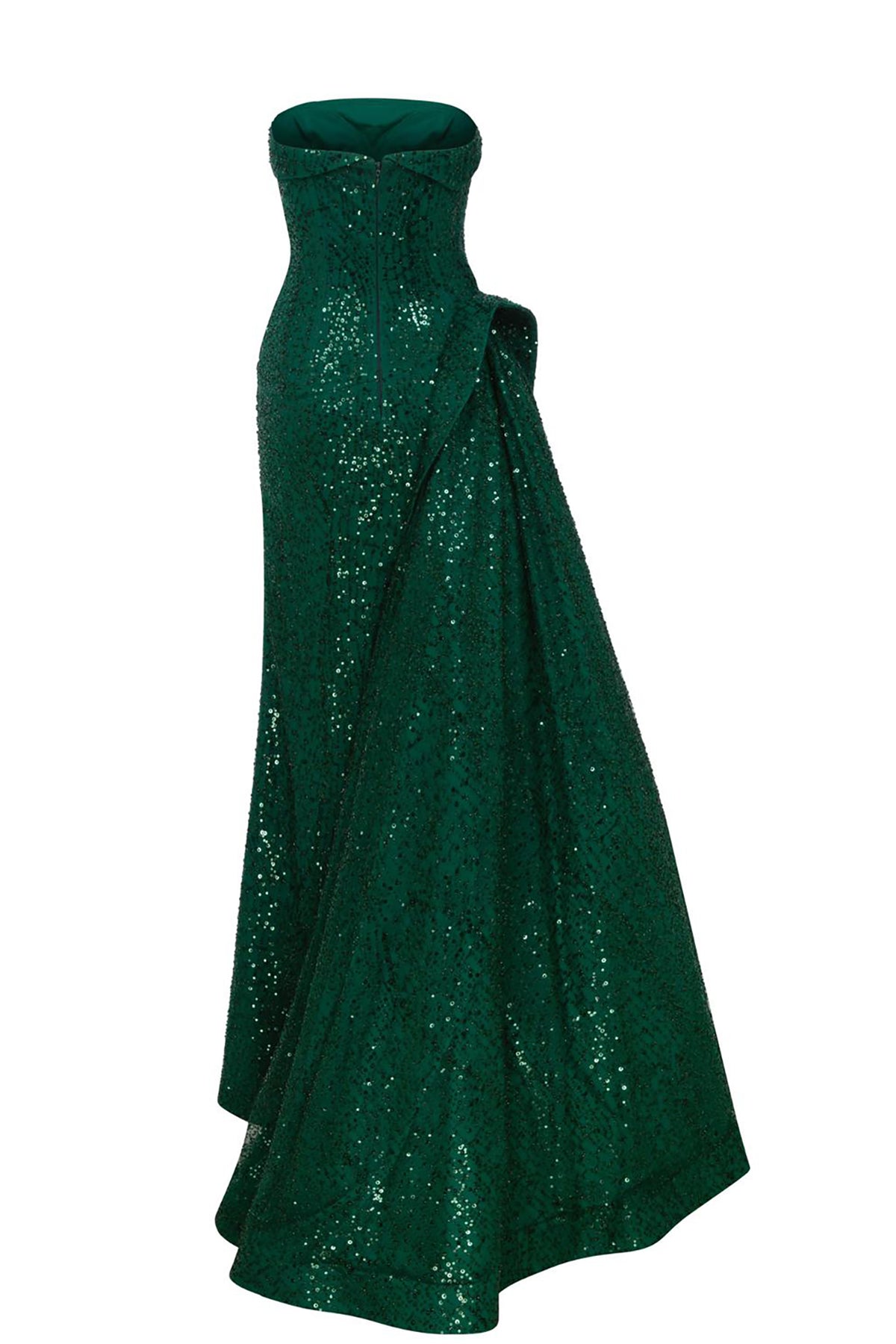 Green strapless long dress. Featuring a floor-length mermaid dress, the bodice is meticulously fitted with precise seaming or boning to sculpt the torso and accentuate an hourglass silhouette.