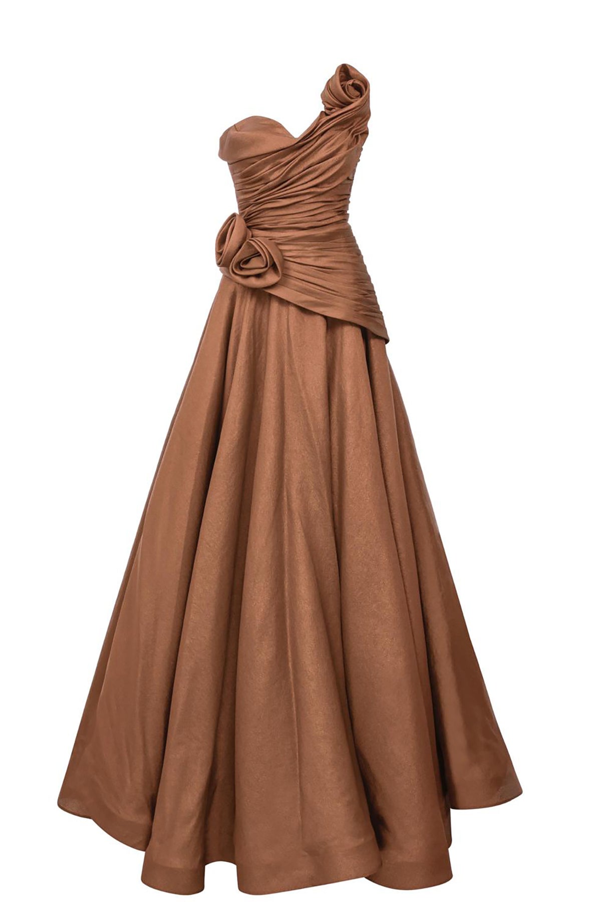Yellow A-line long dress. Featuring a floor-length mermaid gown that hugs the body through the bodice and hips. Complemented with a strapless sweetheart neckline that flatters the décolletage and shoulders.