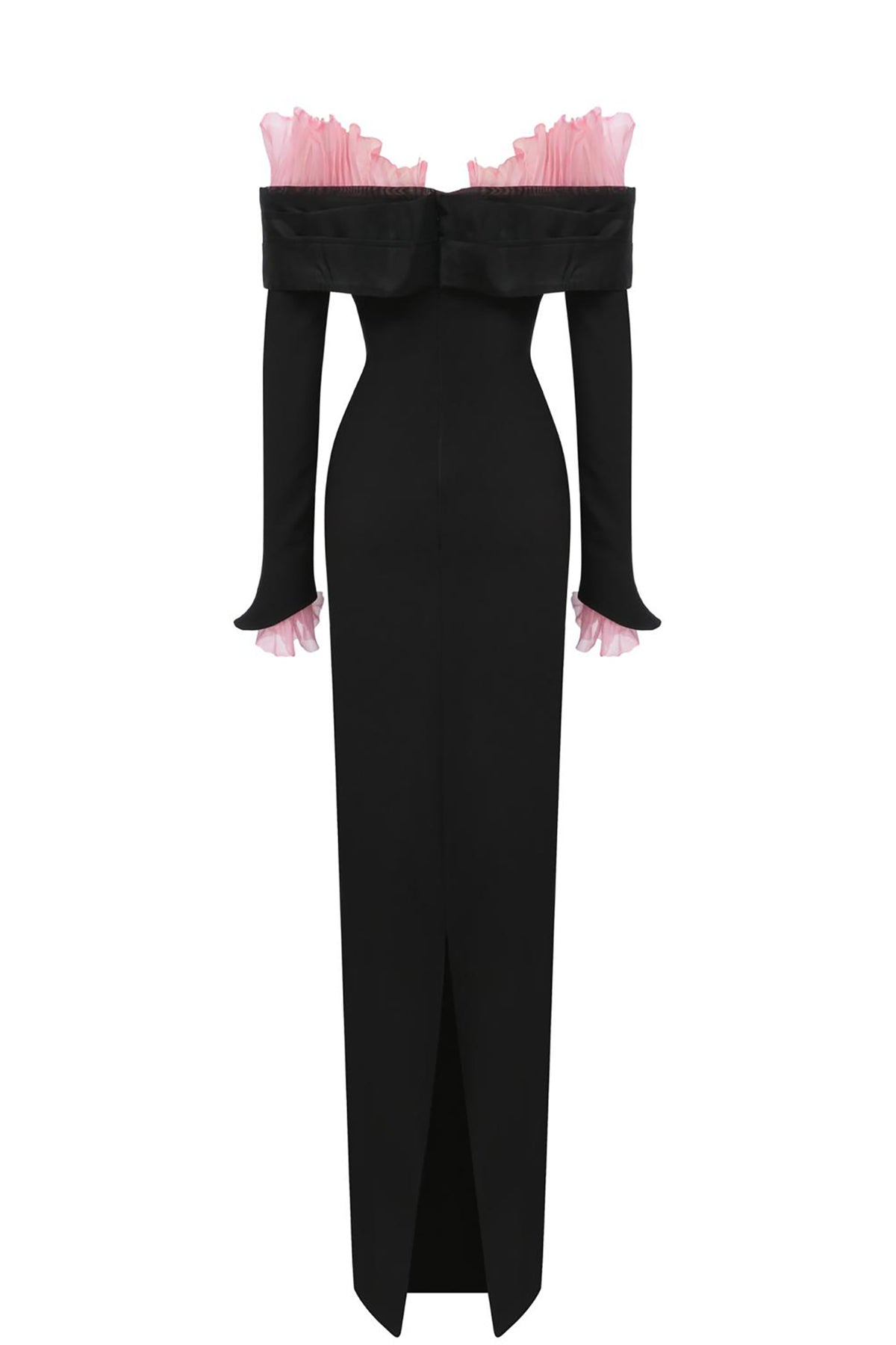 Black and pink crepe long dress. Featuring a one-shoulder design that drapes across the collarbone and a fitted structured bodice with clean precise seams. Complemented with a ruffled edge at the neckline it continues along the outer edge of the sleeve.