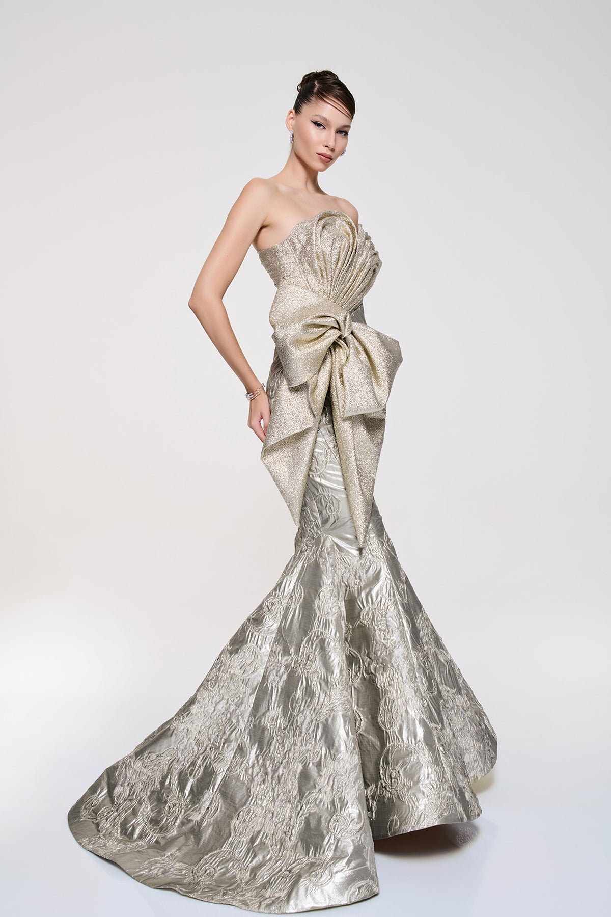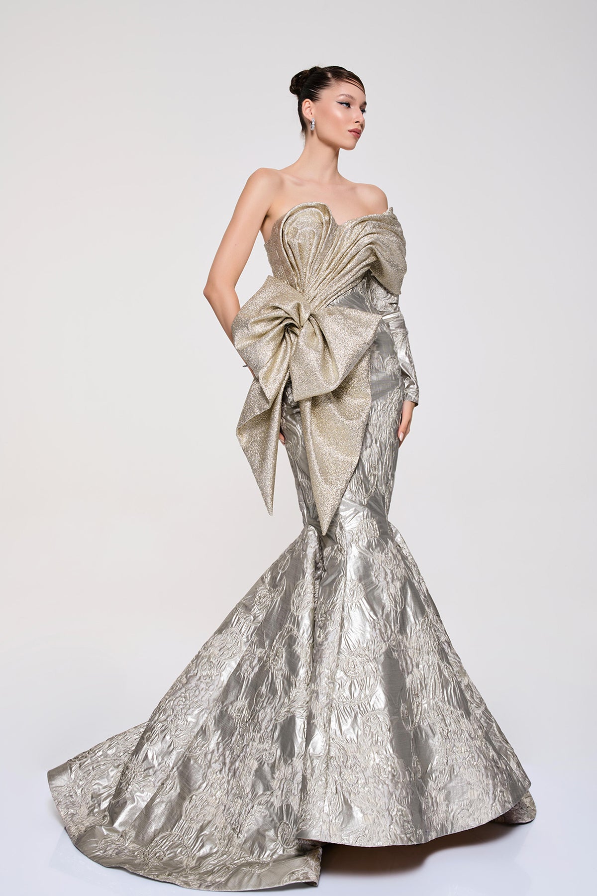 Silver strapless dress. Featuring A floor-length mermaid silhouette that hugs the torso and hips before dramatically flaring into a sweeping train.