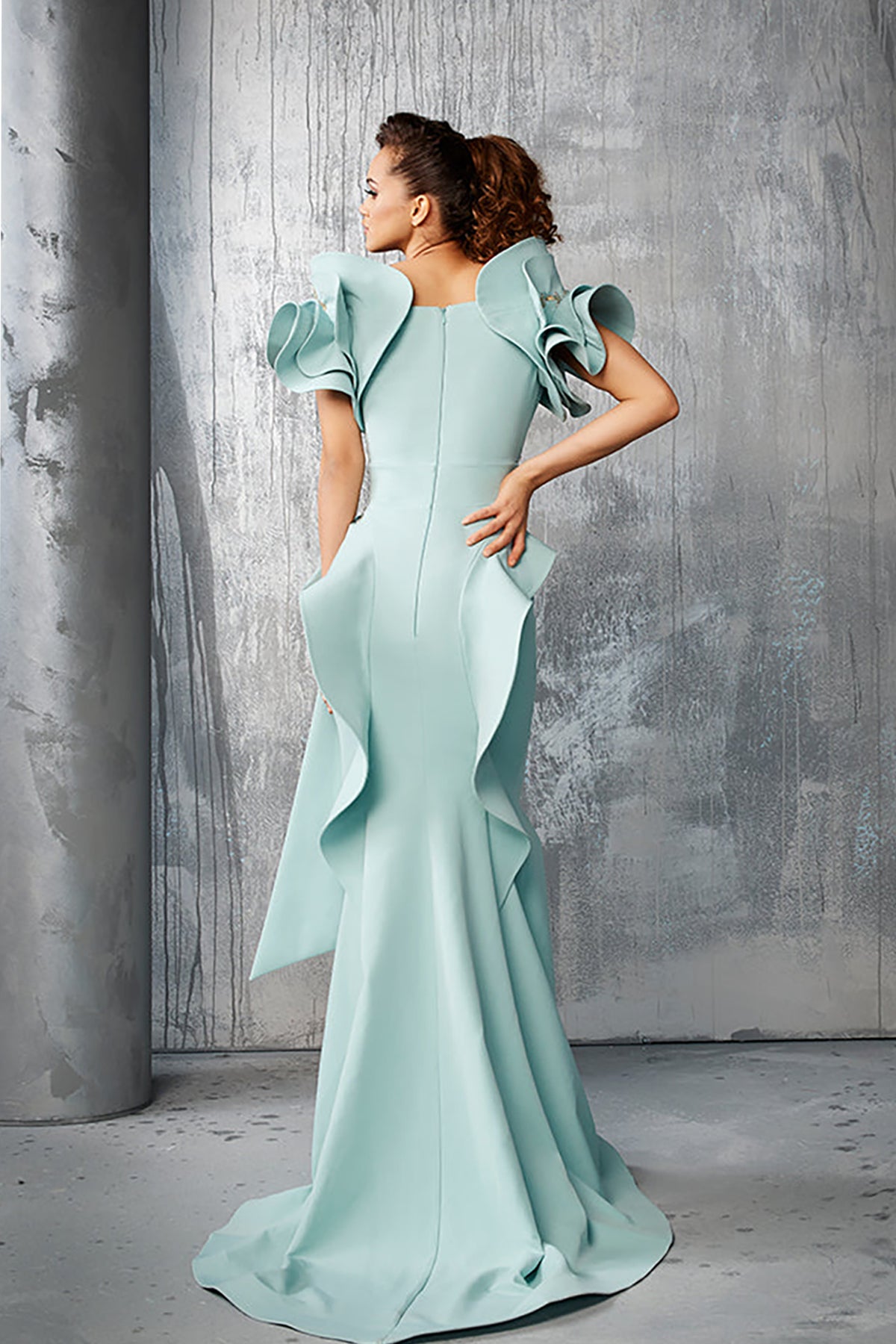 Green crepe mermaid long dress. Featuring a V-neckline ruffled shoulders draped embellishments. Complemented with a handmade embroidery at the waist and bust.