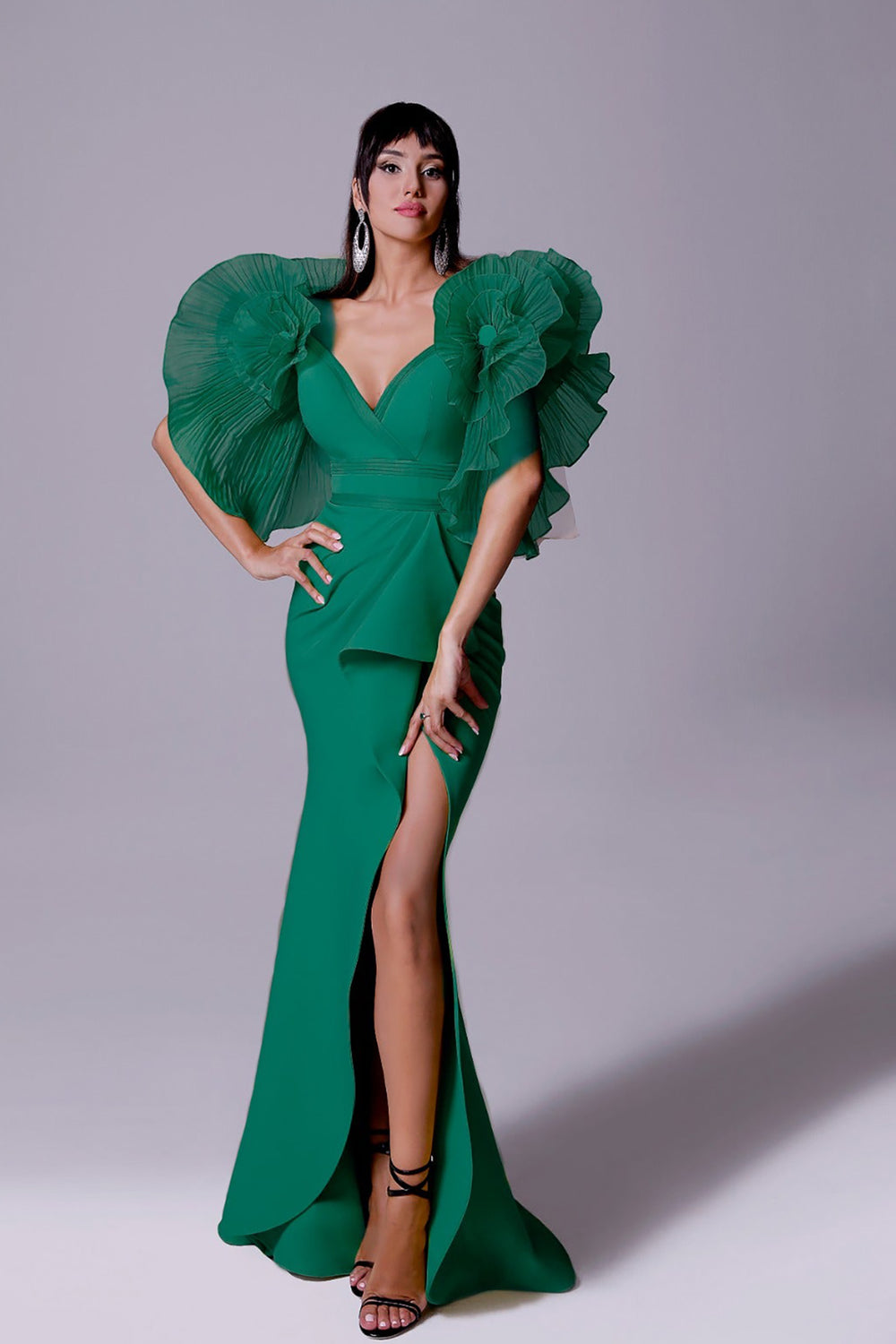 Crepe Mermaid Dress with V-Neckline and Embroidery