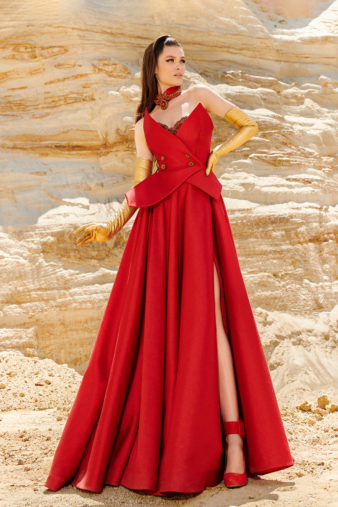 Digitized Organza Strapless Flared Dress with Embroidery