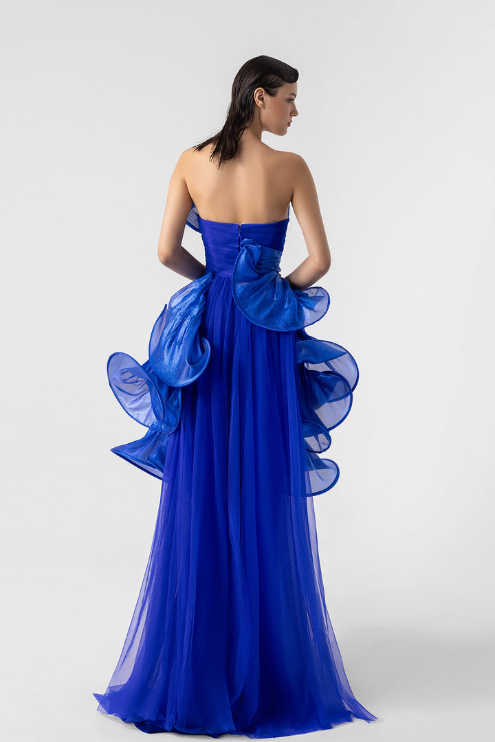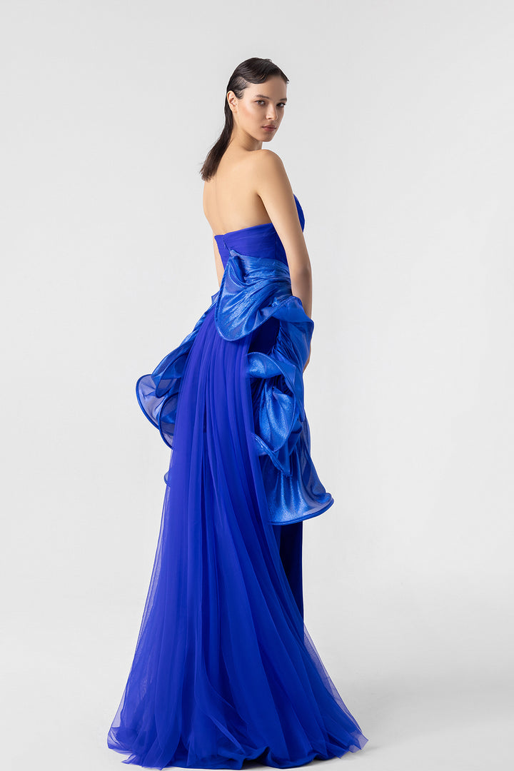 Royal blue dress. Featuring an angled bust shape, and side slit. Complemented with delicate layers of tulle couture drape elegantly over a base of fine crepe, creating a multidimensional texture.