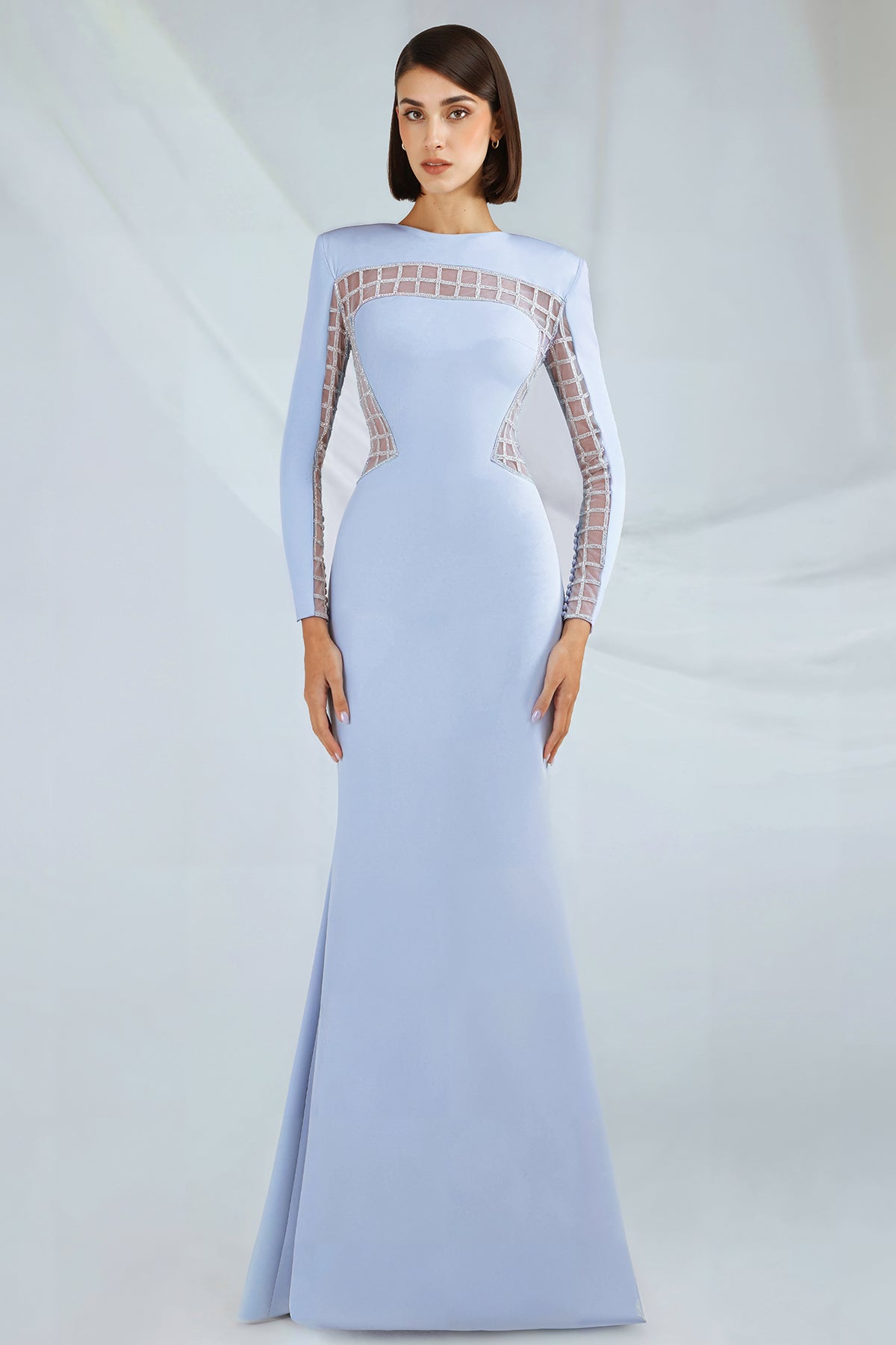 Light blue floor-length crepe dress. Featuring long sleeves, round neckline, fitted silhouette, and mermaid skirt. Complemented with a crystal embroidered tulle panel on sides and back, and a hidden back zipper.