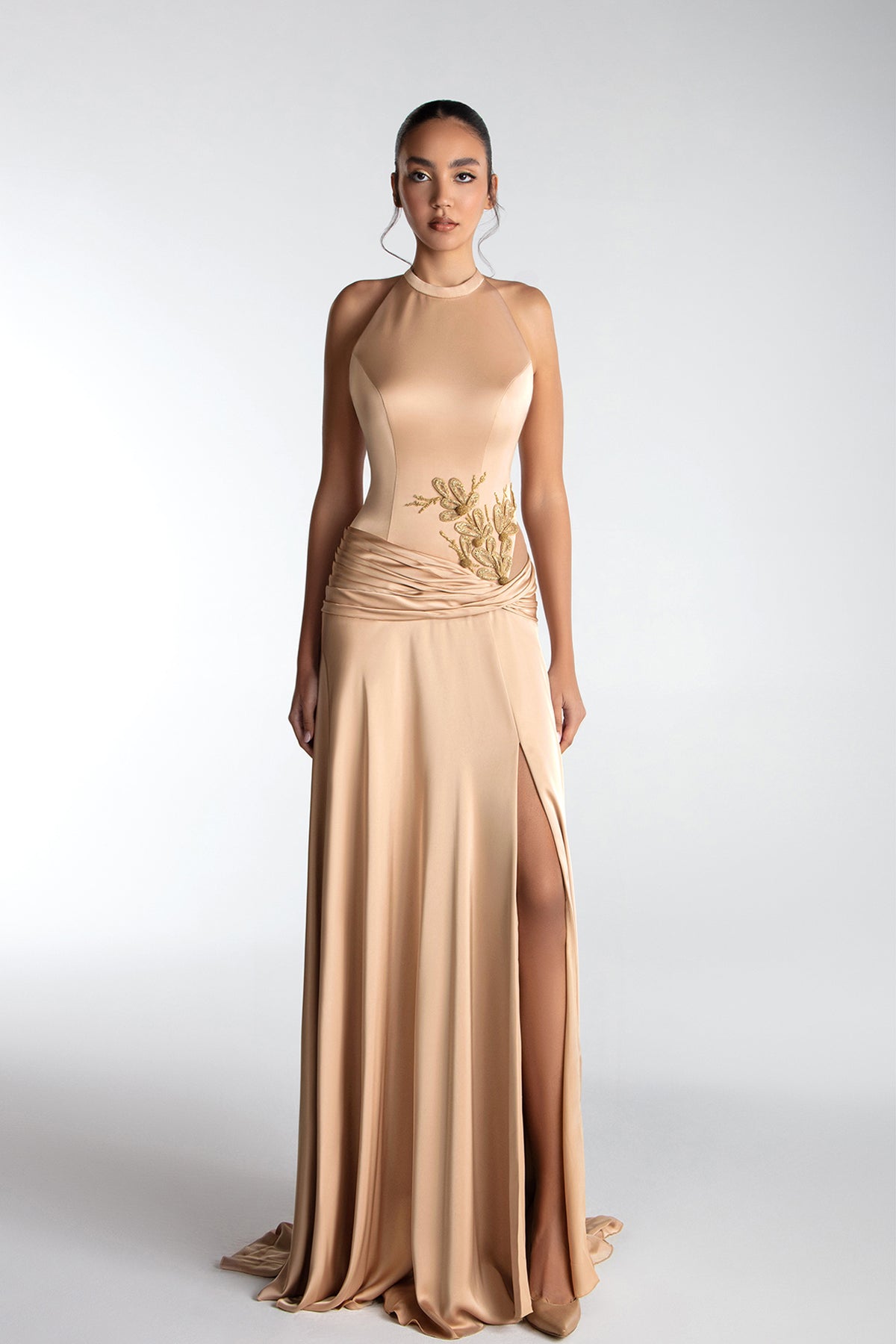 Satin gown featuring a fitted halter bodice with a high neckline, floral hand embroidery at the waist, draped detailing over the hips, a flared skirt with a thigh-high slit, and an open back.