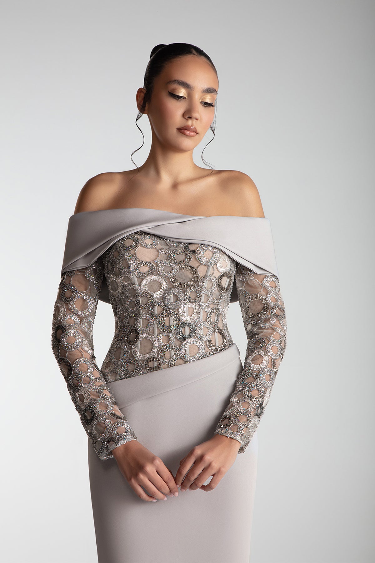 Tailored in crepe with an asymmetric waist drape and off-shoulder folded neckline. The bodice and sleeves are fully hand-embroidered with sequins and beads over tulle, complemented by a side slit and flared hem.