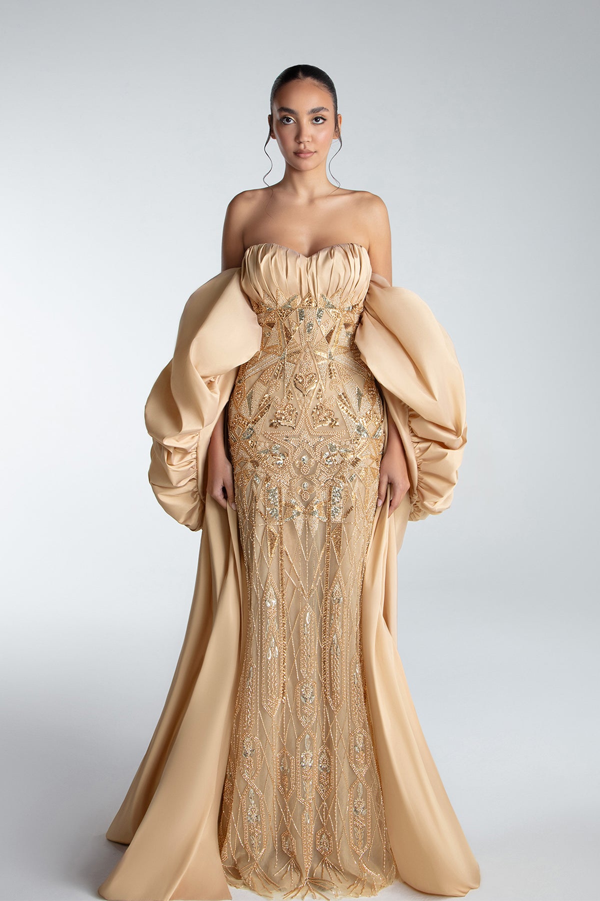 Gold strapless gown features a ruched bust and a fully hand-embroidered fitted base embellished with sequins, beads, and crystals. A dramatic taffeta cape is gathered into sculptural volume at the back, extending into a sweeping train.