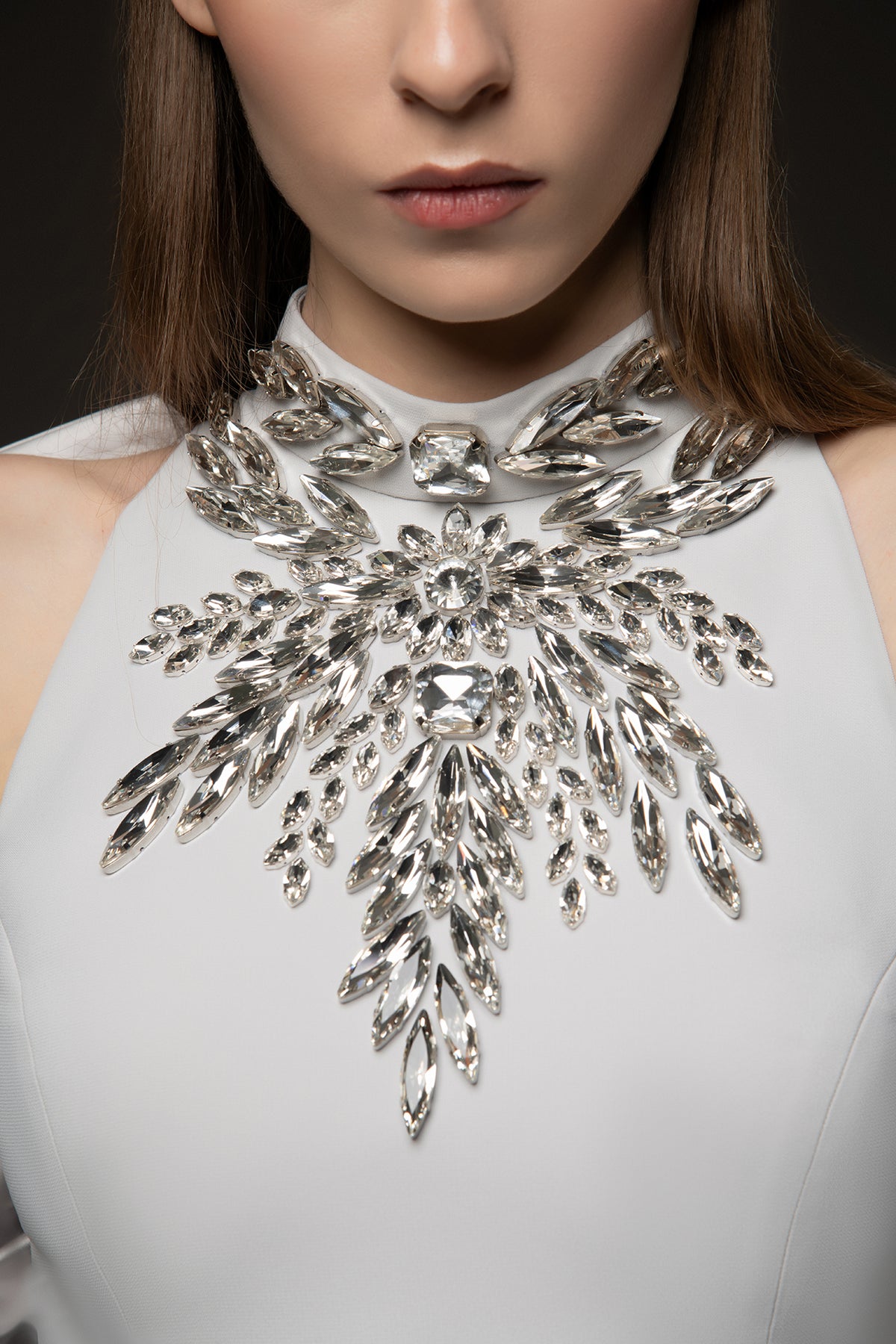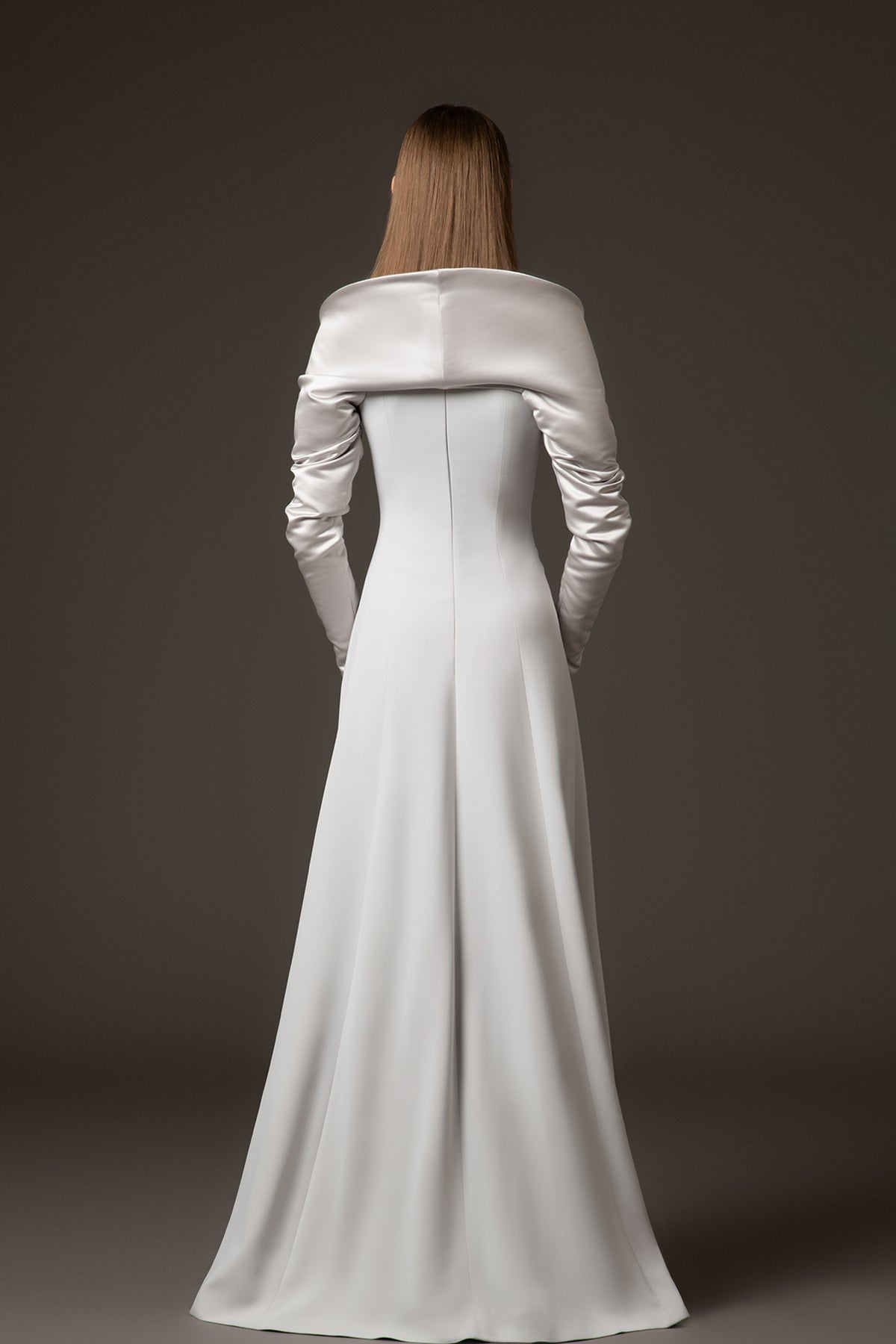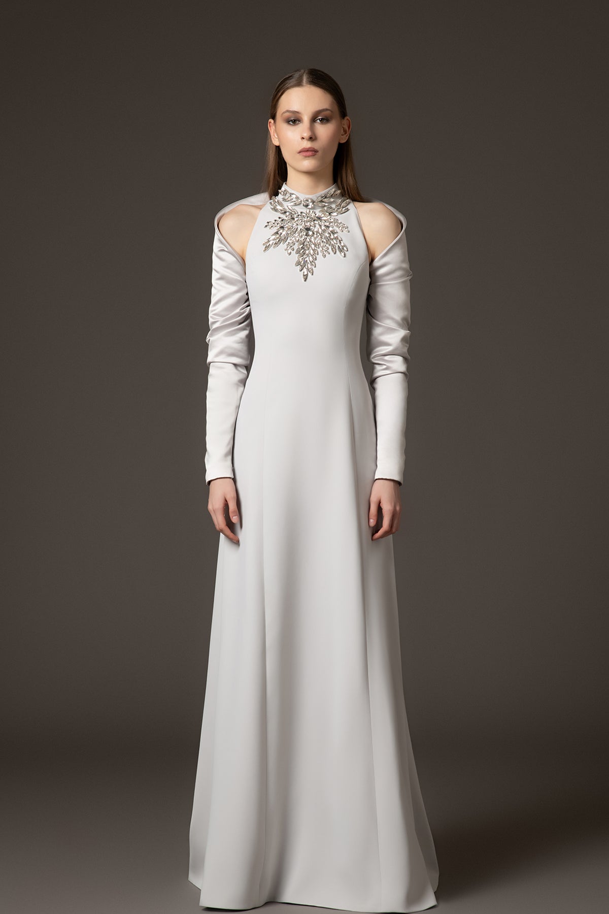 Light grey crepe A-line long dress. Featuring a halter-neck with a fitted silhouette and long sleeves.