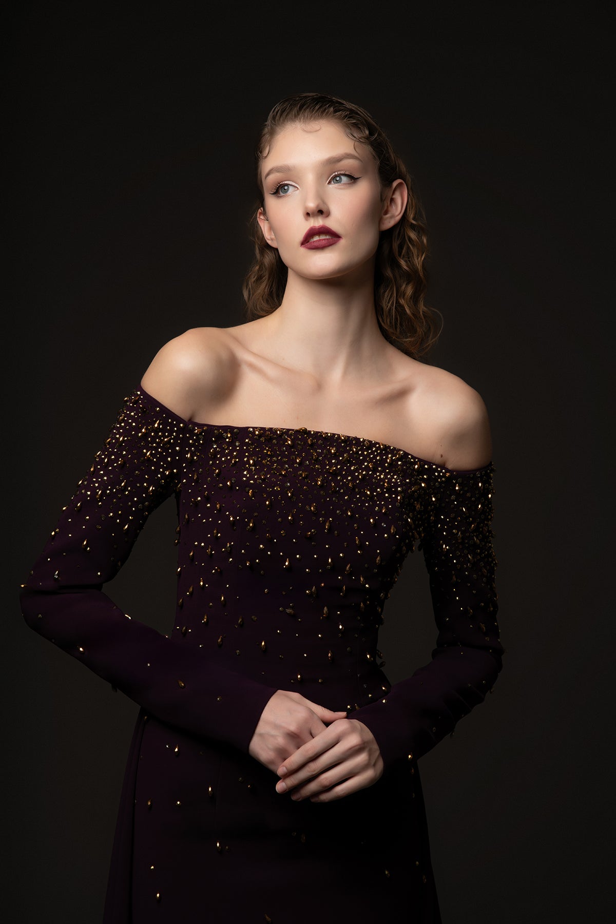 Burgundy crepe column long dress. Featuring an off-the-shoulder with a fitted silhouette and long sleeves.