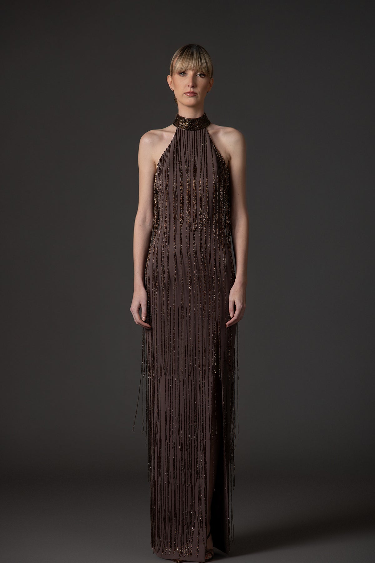 Brown crepe long dress. Featuring a beaded fringes with halter-neckline sleeveless and center back zipper with a side slit.