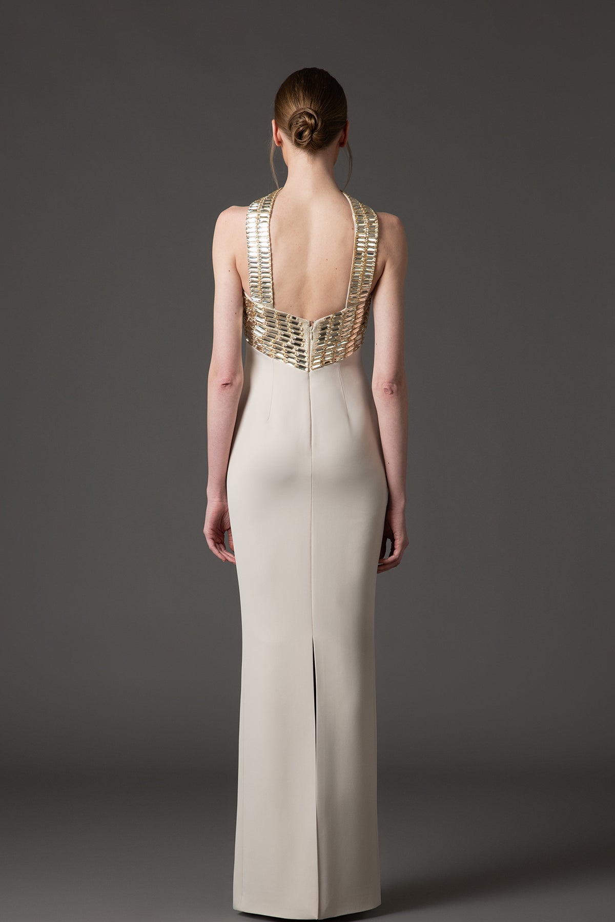 Beige column crepe dress. Featuring a paired with baguette embroidery halter neckline.