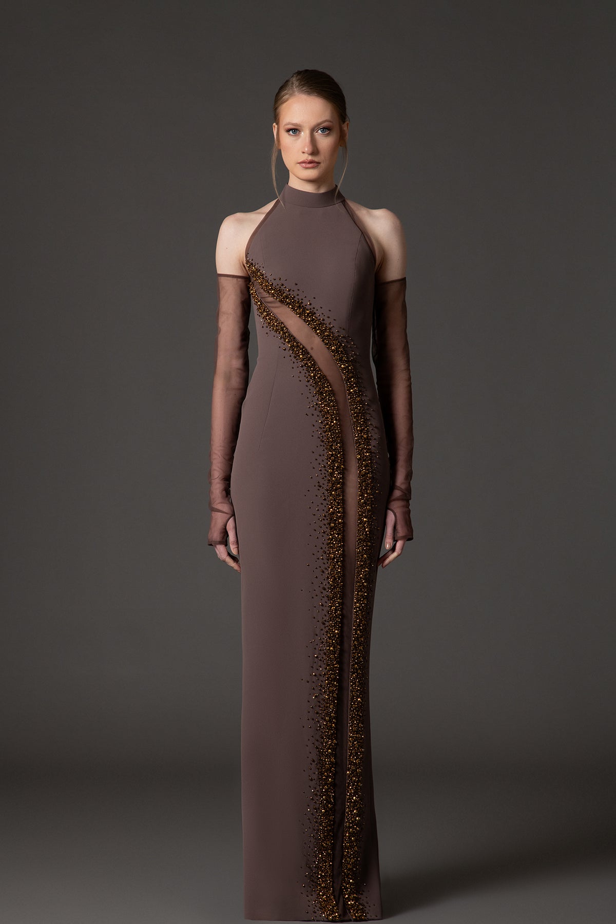 Coffee brown crepe long dress. Featuring a halter-neckline with embroidery tulle cutout and back zipper with center back slit.