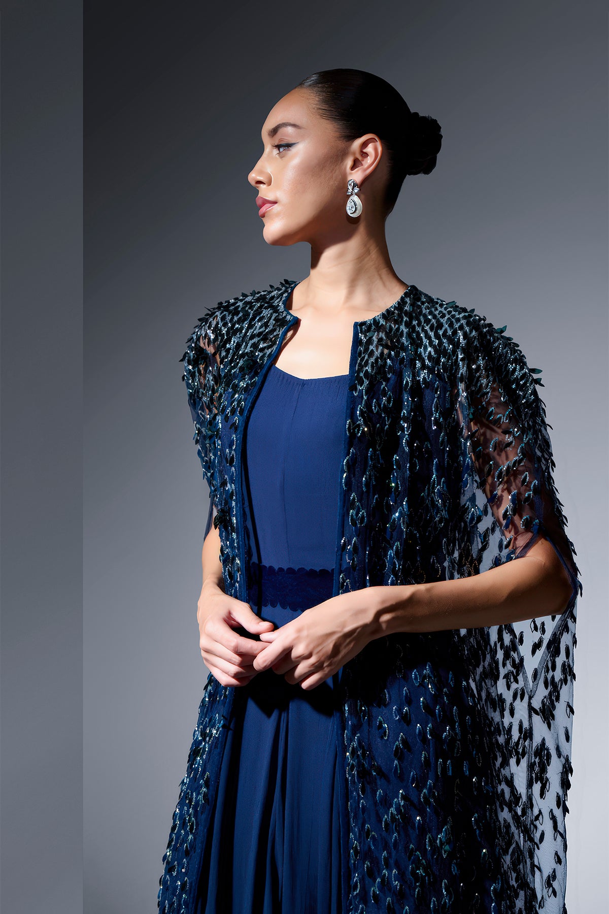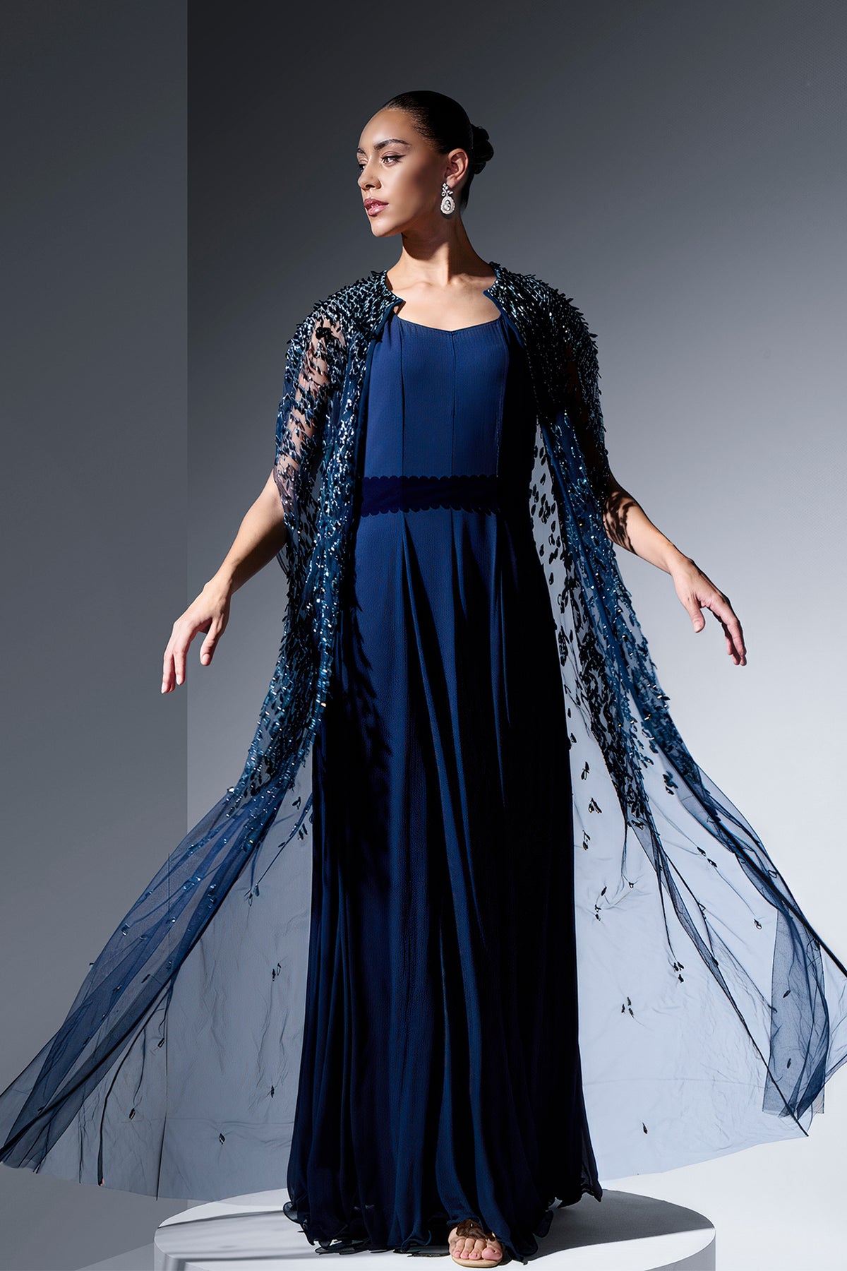 Navy tulle two-piece. Featuring a cape crafted from soft, flowing tulle with intricate leaf-like laser cutouts that create a delicate, airy effect. Complemented with a silk georgette A-line dress, a stunning piece, designed navy tulle cape is perfectly. Completed with a highlight of this design is the matching velvet belt.
