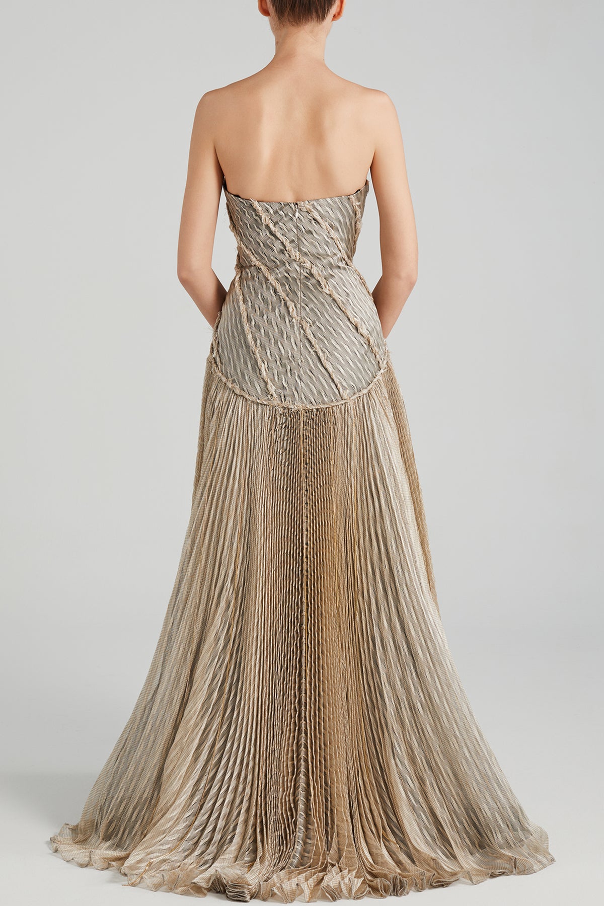 Beige A-line dress. Featuring the draping at the bust to the twisted details at the bodice to the sun-ray pleats on the skirt. Complemented with a long number with a scoop-neckline bustier with the flowy bottom. Completed with dangling crystal chains all over.