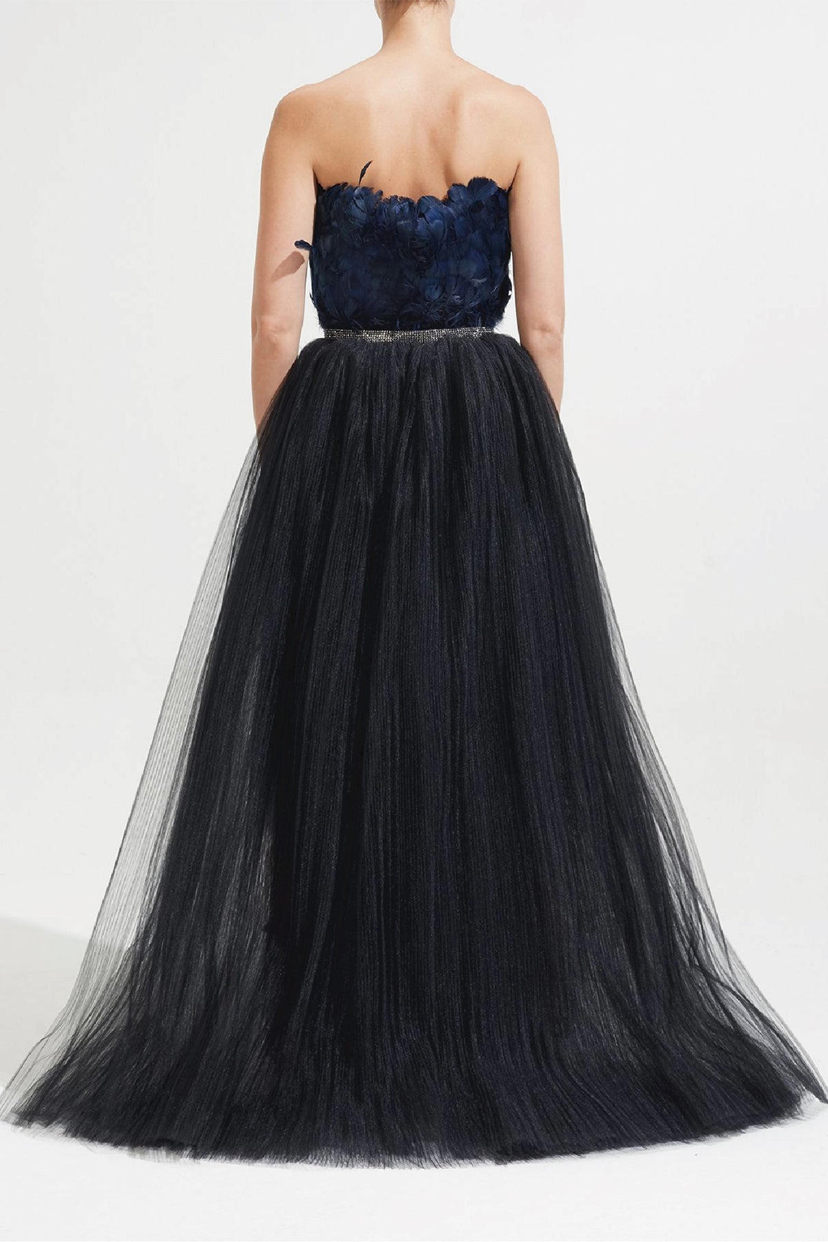 Multicolor strapless fitted dress. Featuring a midnight blue feather bodice blending into a colour-degrade ostrich feather skirt, enhanced with dancing black feathers. Complemented with a detachable full skirt train in multi-layers of tulle.