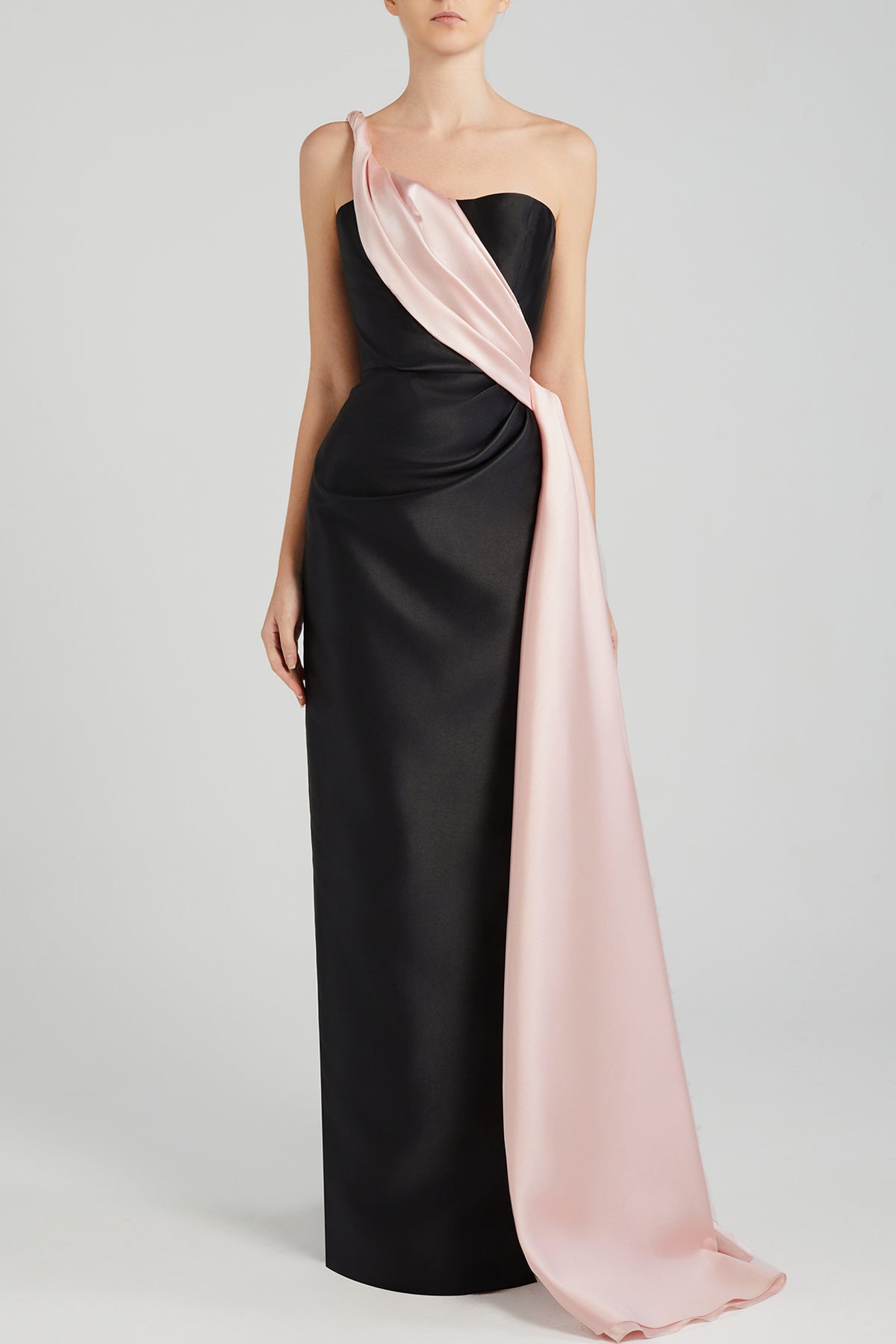 Black and pink royal sash dress. Featuring a long starts with a tapered dress in taffeta and is accentuated by soft pink drapes side into a flowing train. Complemented with a twisted single strap while pleats at the waist sculpt the silhouette.