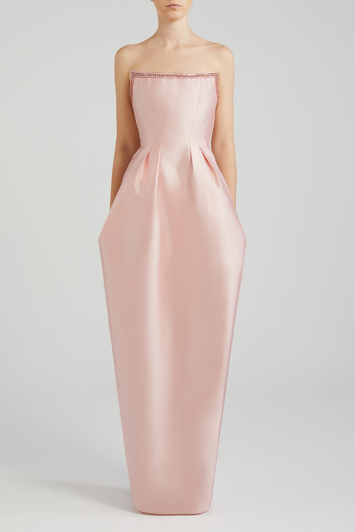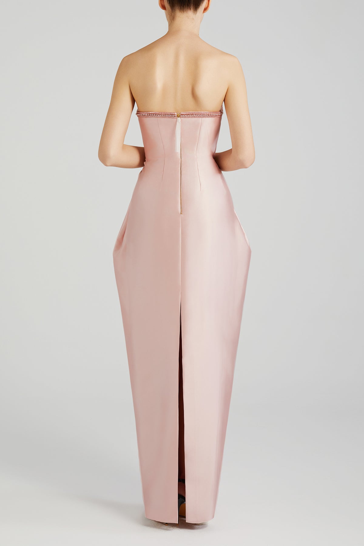 Light pink strapless cocoon taffeta dress. Featuring a scoop neckline that is adorned with two contrasting crystal chains. Complemented with a pleats lend that wrapped silhouette.