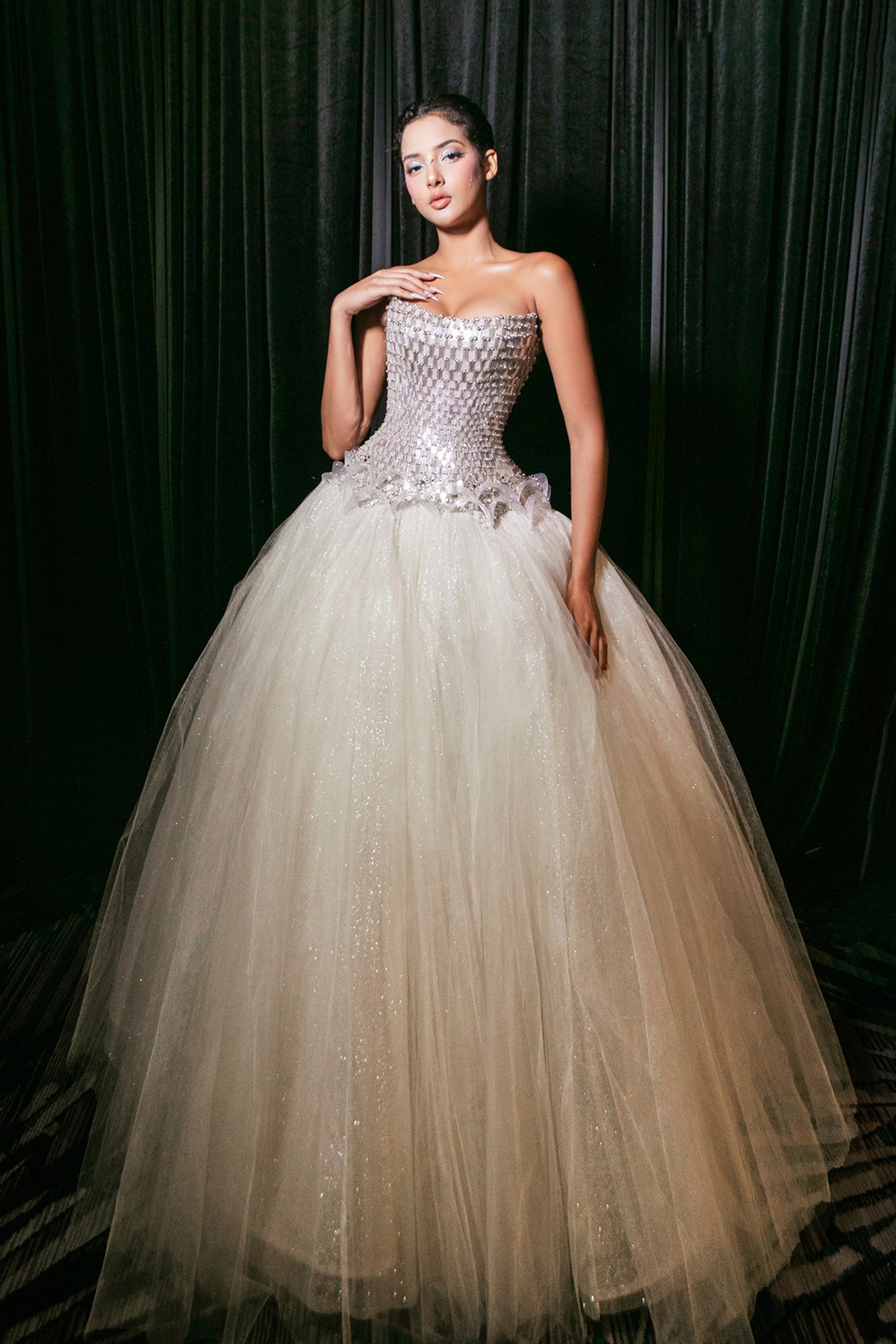 White a-line long dress. Featuring a fitted corseted bodice that tapers to the natural waist with a strapless neckline that frames the collarbone and shoulders. Complemented with a corseted and structured with boning to create a sculpted waist and a smooth. Completed with Multiple layers of tulle create depth and volume.