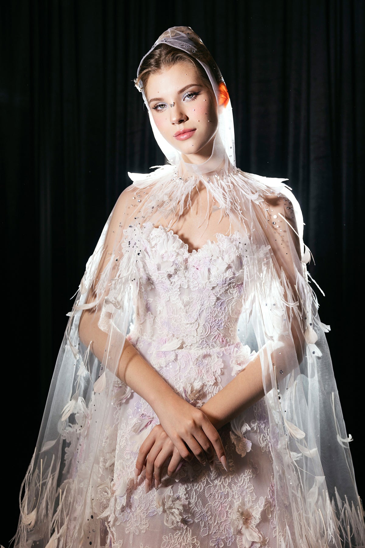 Ivory a-line long dress. Featuring a strapless sweetheart neckline transitioning to a tightly boned, sculpted bodice that cinches at the waist. Complemented with a skirt flares into a full a-line silhouette and adorned with hand-sewn embroidery, beads, and crystals that catch light from every angle.