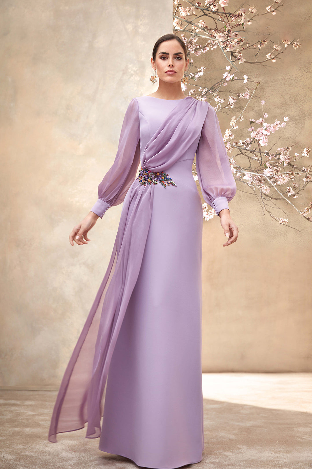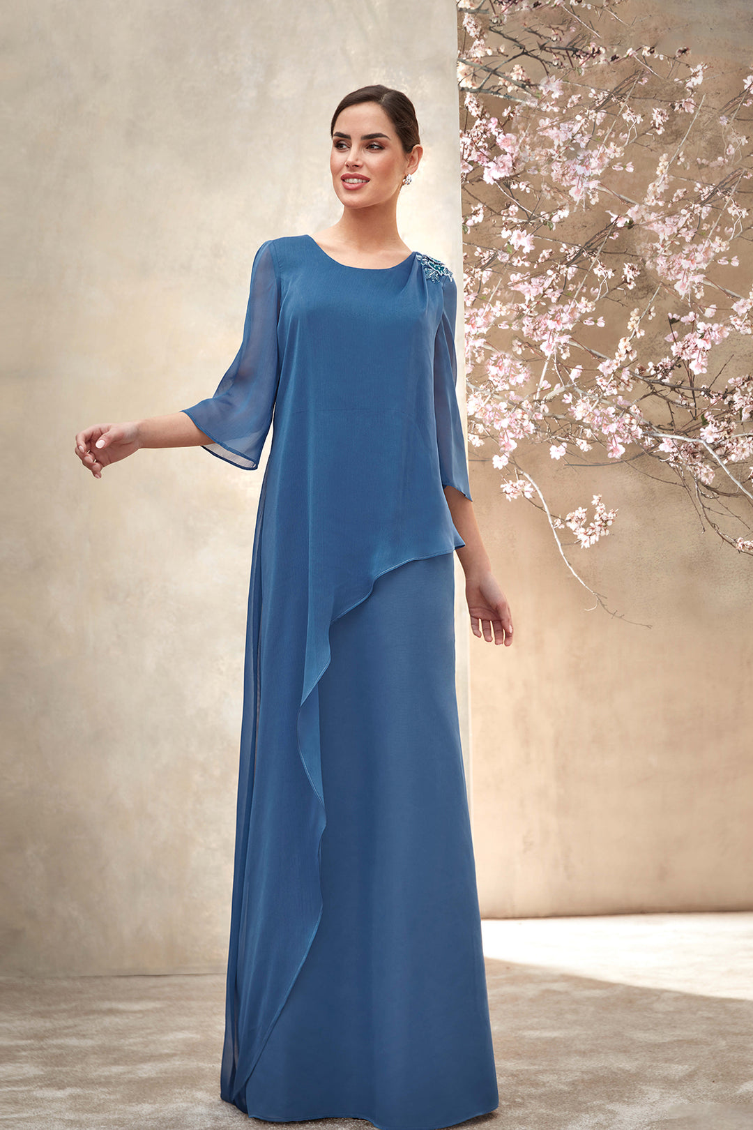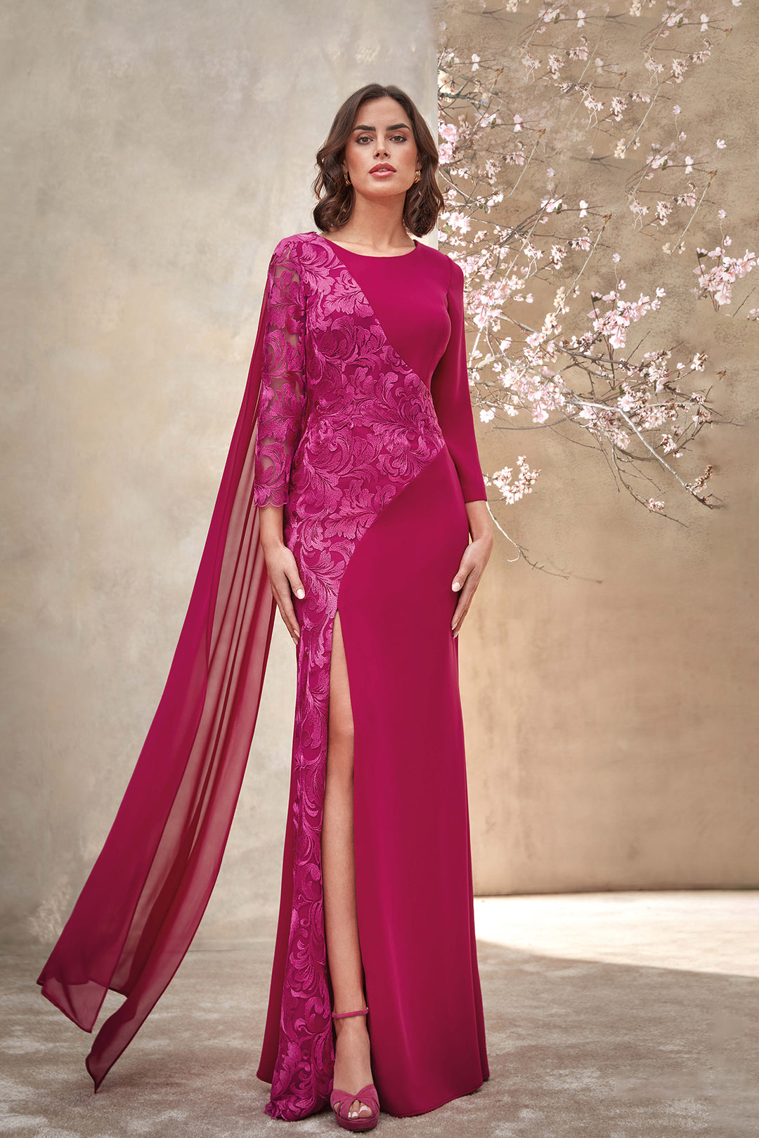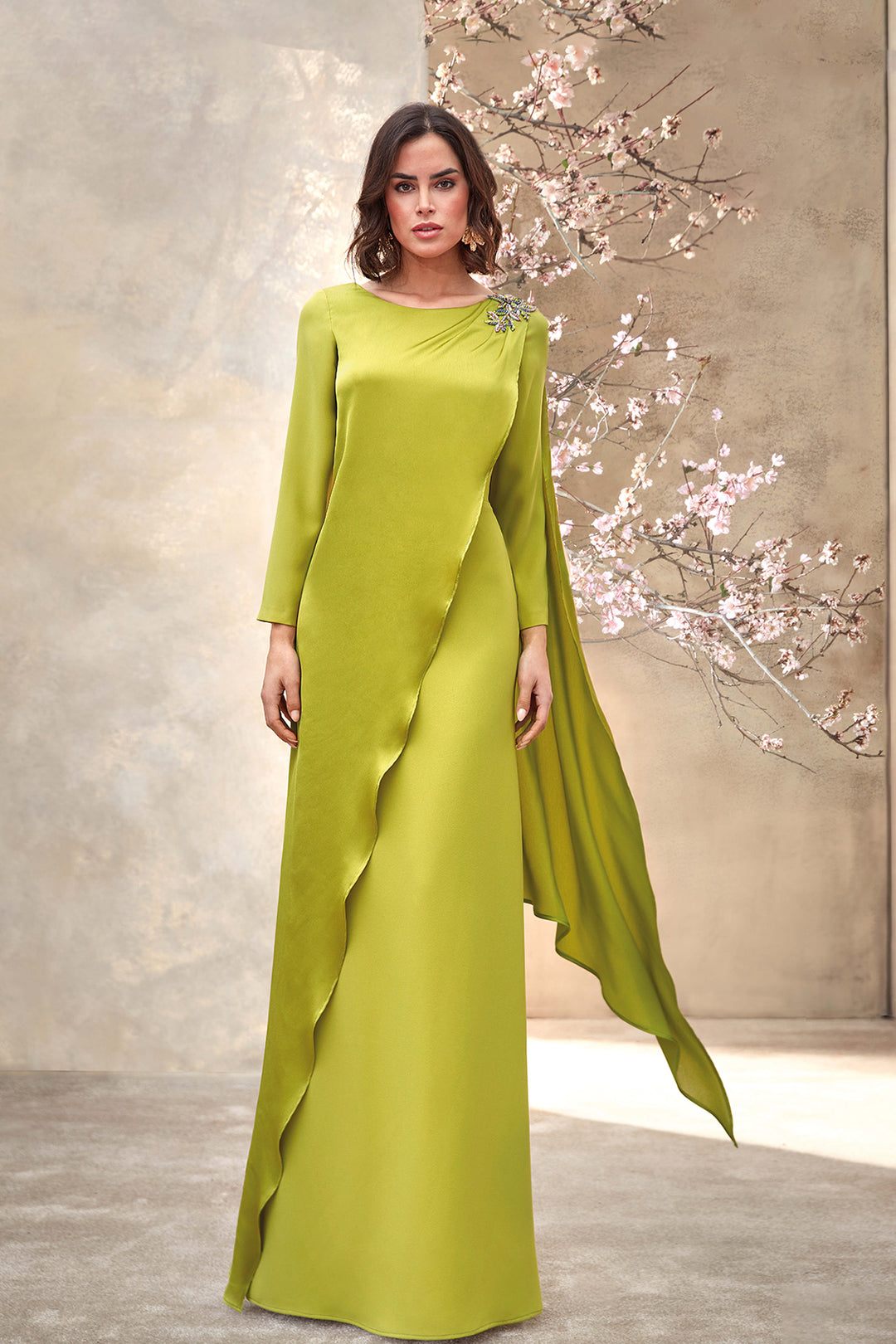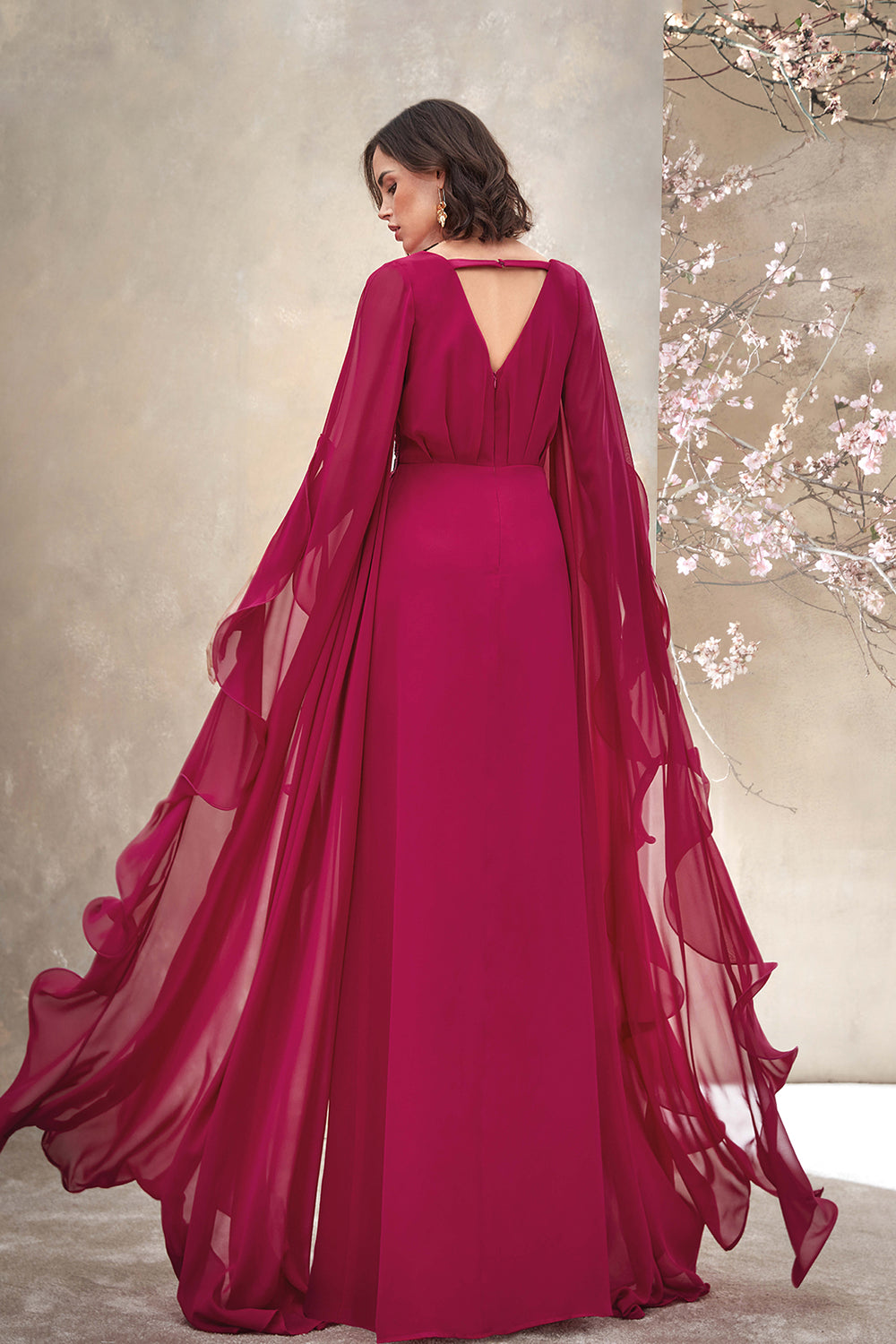 Chiffon Dress with Cape and Floral Detail