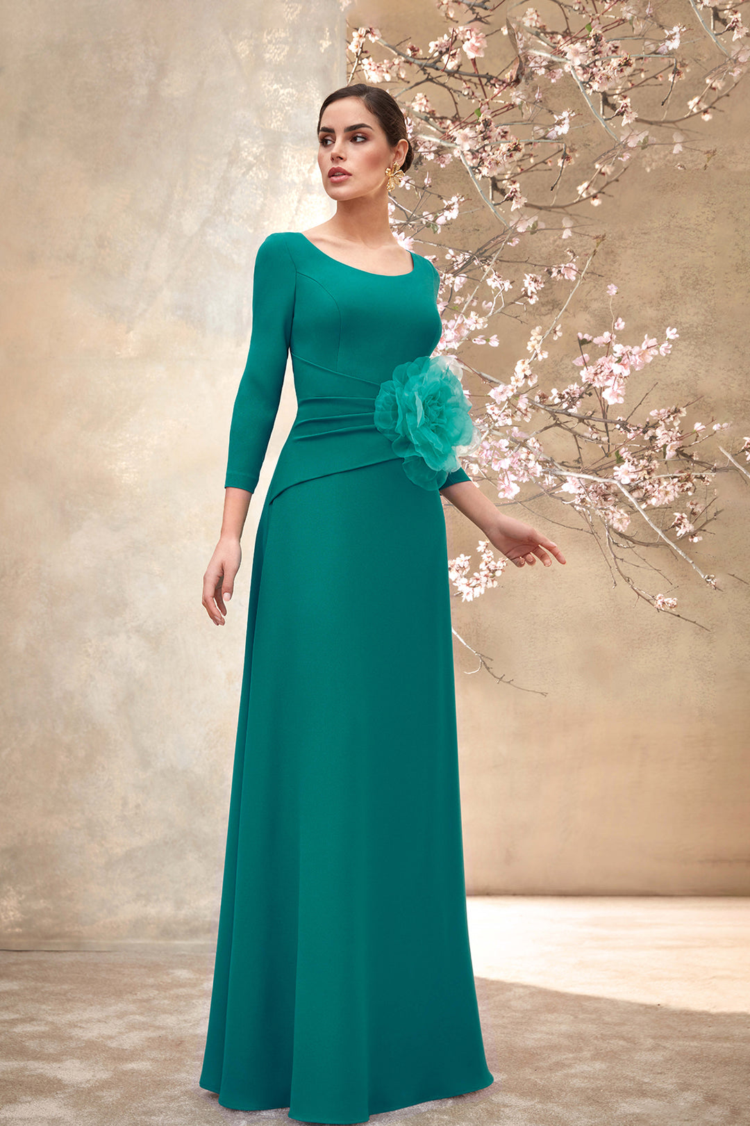 Crepe Dress with Pleated Waist and Organza Flower