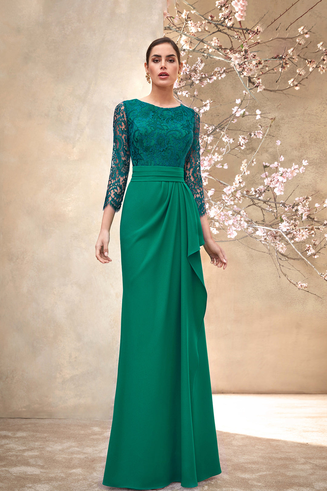 Mermaid Crepe Dress with Lace and Chiffon Drapes
