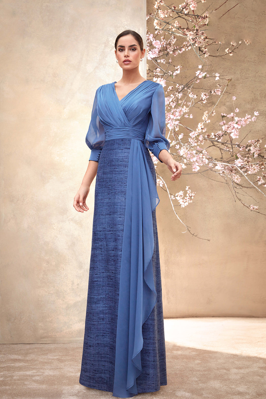 Crepe Long Dress with Satin Overlay