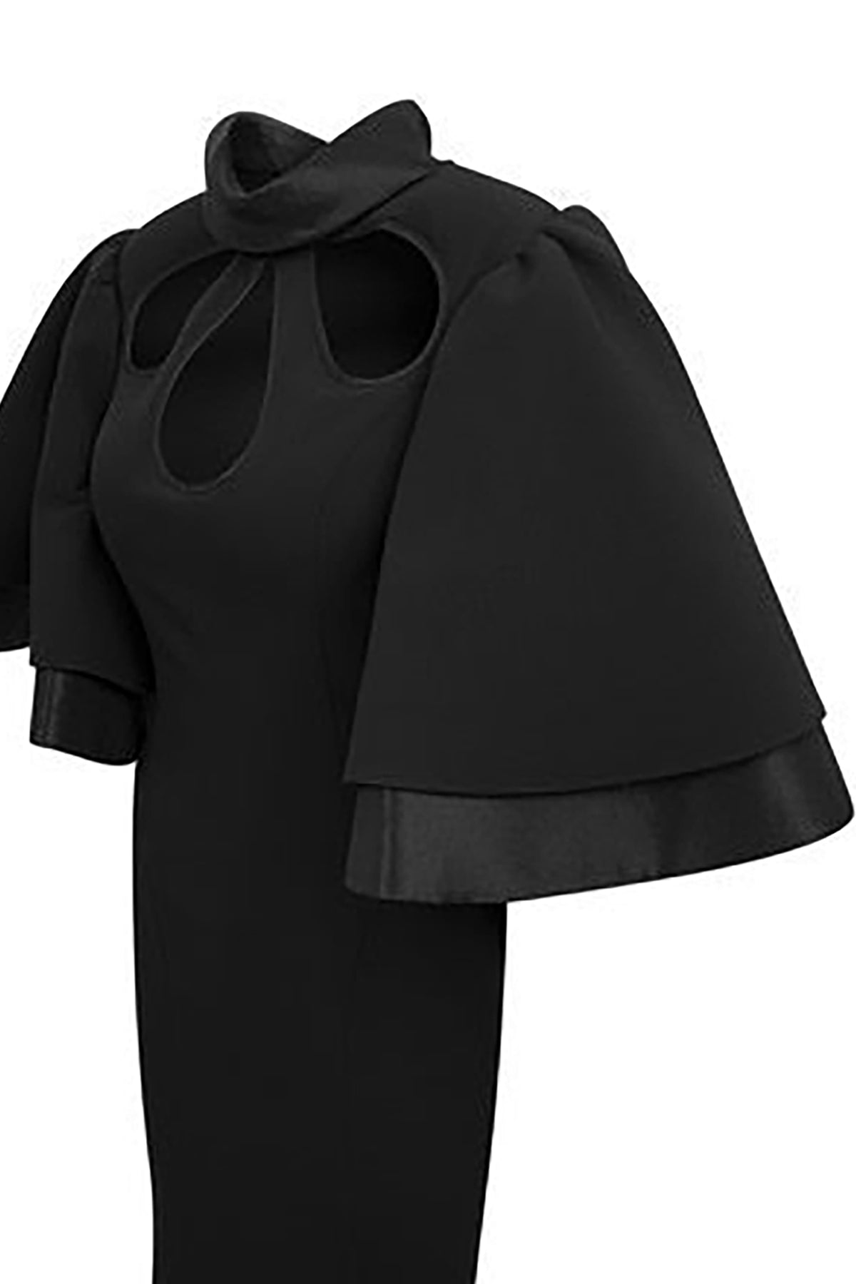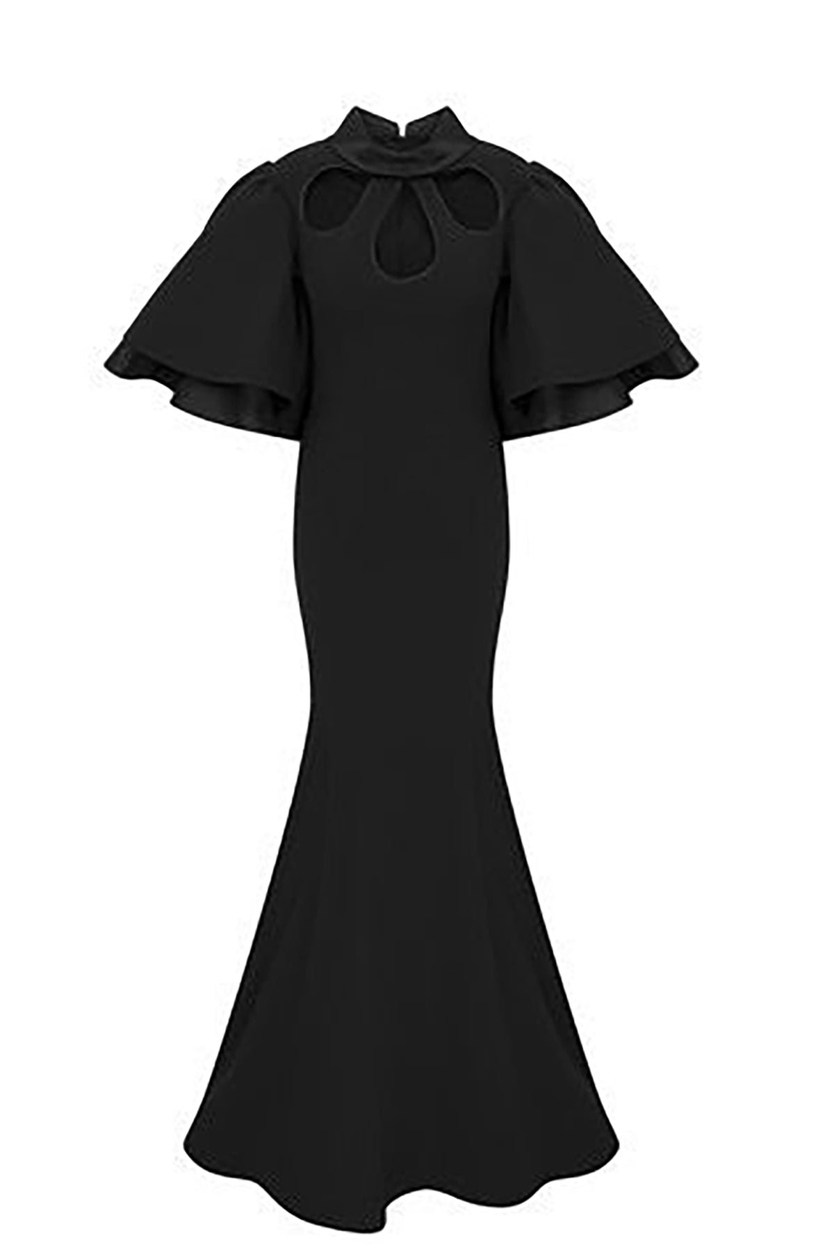 Royal blue short-sleeve long dress. Featuring a metallic laminated crepe fabric with an asymmetrical upper neck cut and an off-the-shoulder style on a single side. Complemented with a body-fitting mermaid silhouette with a tail fully draped detailing, and embellishments at the waist.
