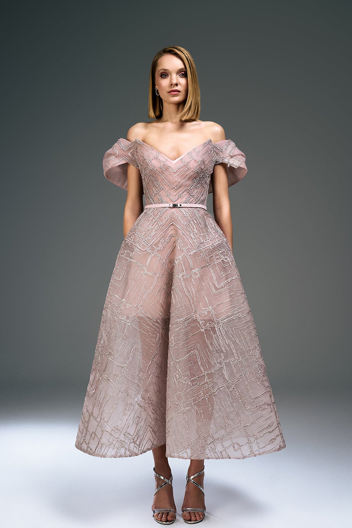 Rose pink with a subtle champagne sheen dress. Featuring a satin a-line silhouette with an off-the-shoulder neckline. Complemented with a cape-like the sides and back flows from the bodice.