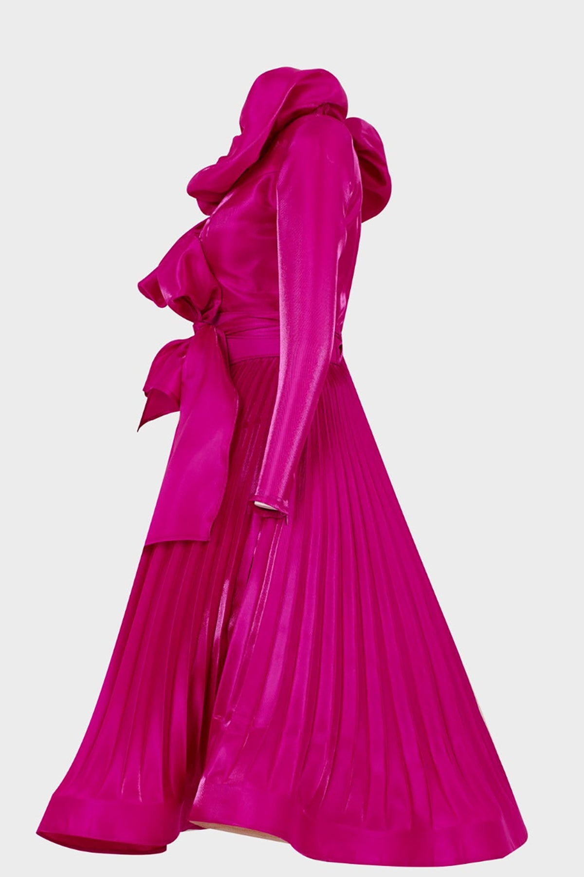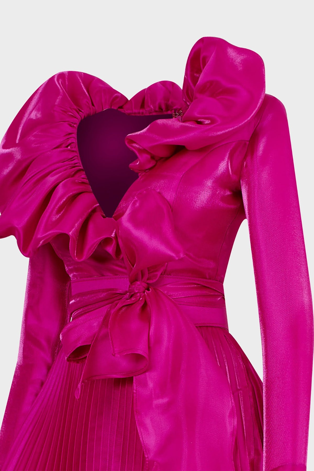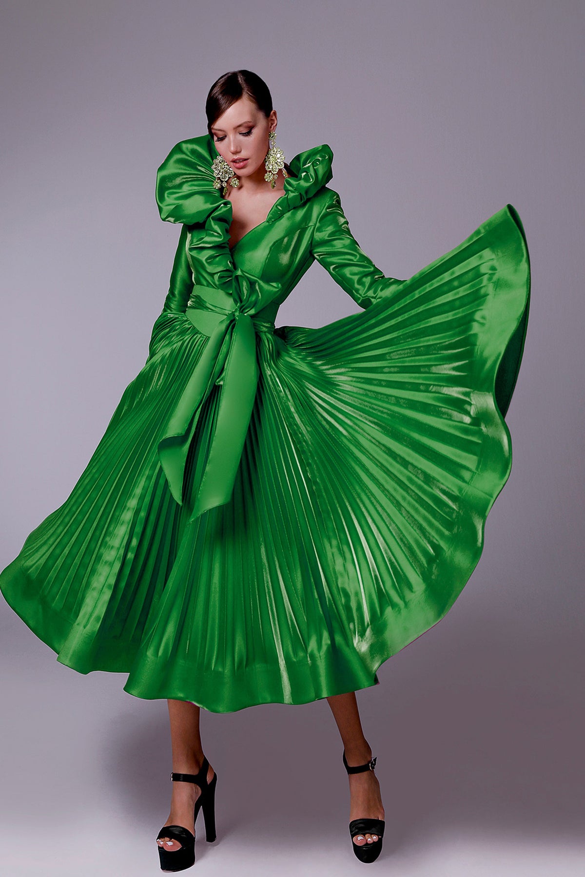 Green tafta ramaje short dress. Featuring a V-neckline with flared silhouette and long sleeves. Complemented with a draped waist tie and bust drapes.