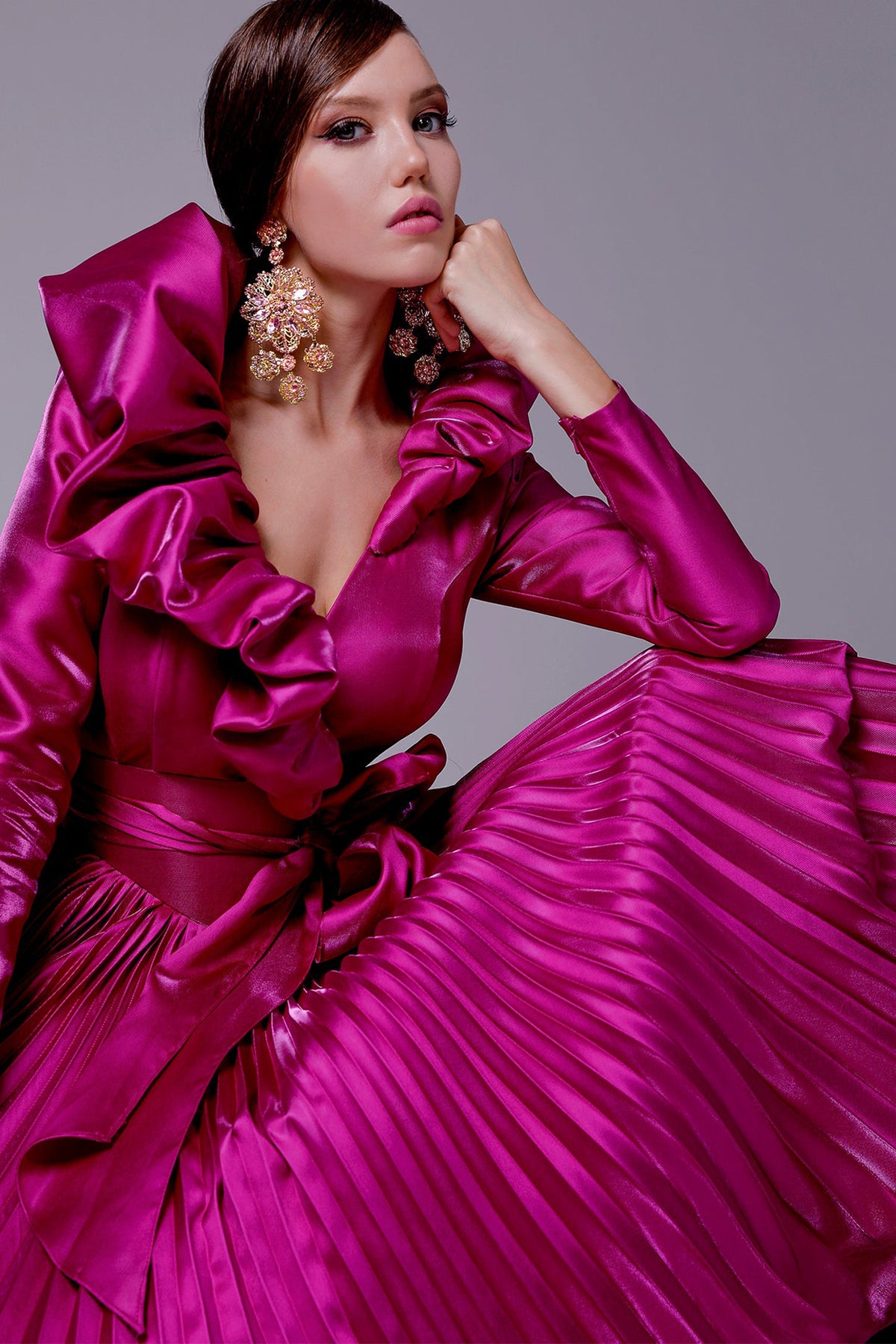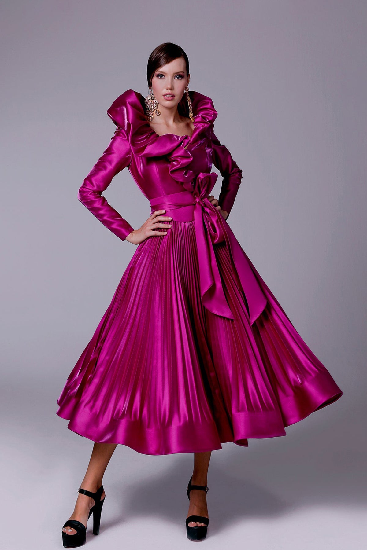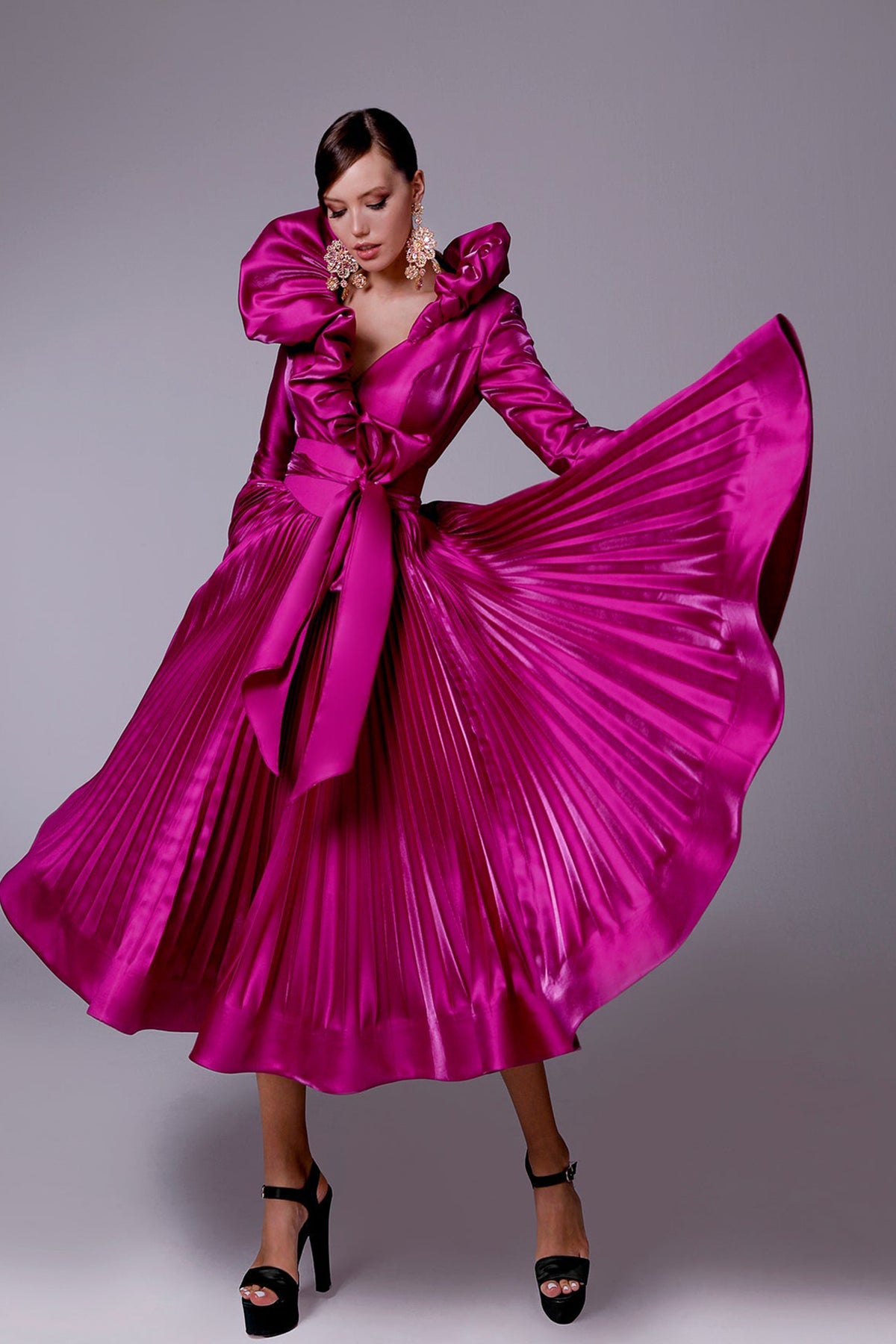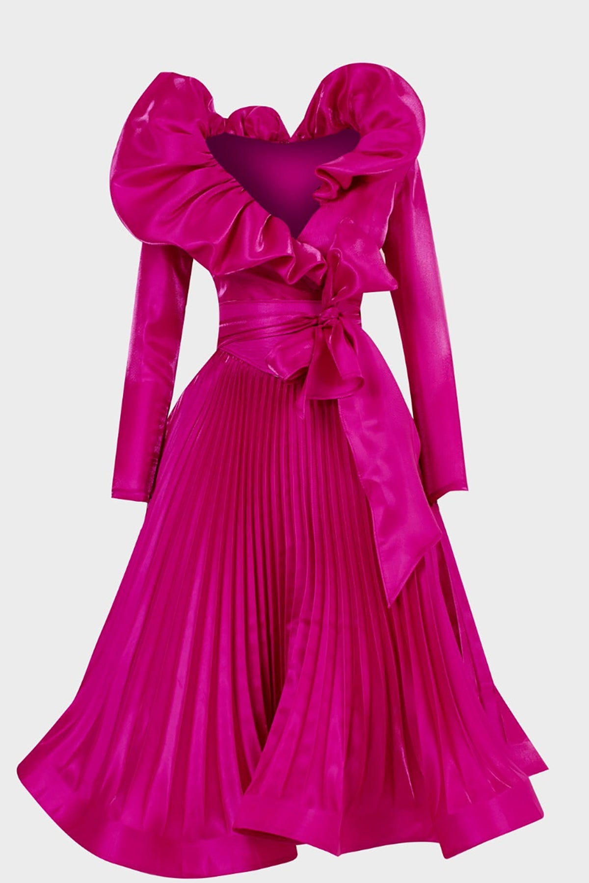 Green tafta ramaje short dress. Featuring a V-neckline with flared silhouette and long sleeves. Complemented with a draped waist tie and bust drapes.