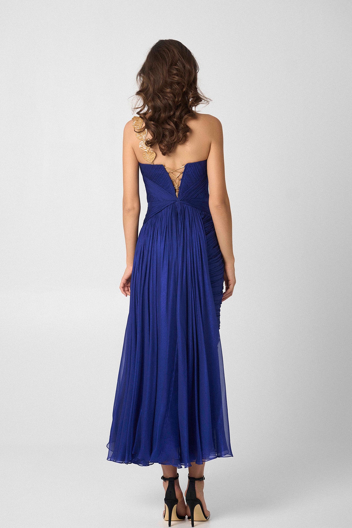 Deep blue silk mousseline midi dress. Featuring one-shoulder bodice is fitted and adorned with intricate lace or embroidery details. Complemented with an asymmetric skirt that flows gracefully from the fitted waist, made from the same lightweight, sheer fabric.