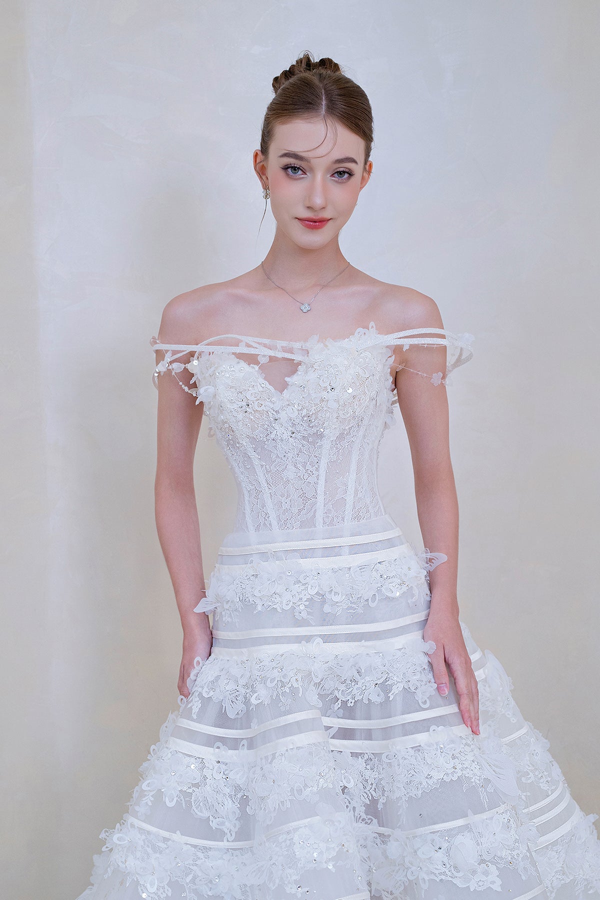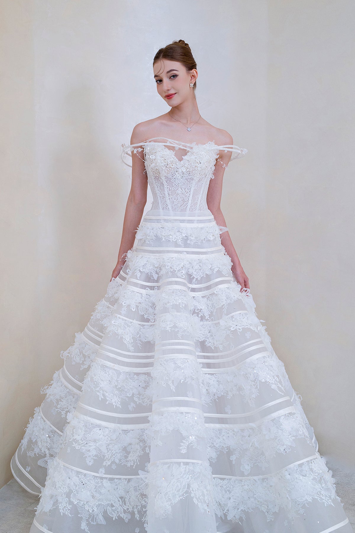 White a-line long dress. Featuring an off-the-shoulder neckline corset-inspired piece that hugs the torso to emphasize the bust and waist. Complemented with a densely embellished with pearls, crystals, and fine embroidery and the beading forms delicate, vertical and floral motifs that sculpt the torso.