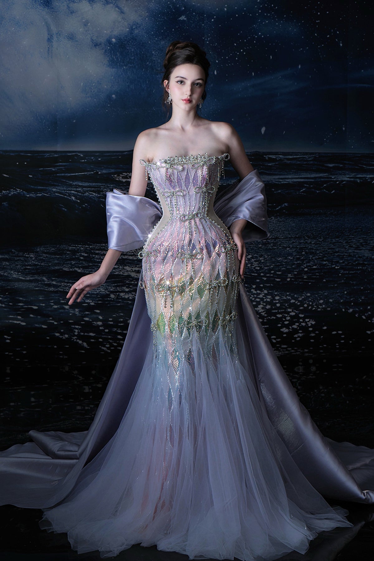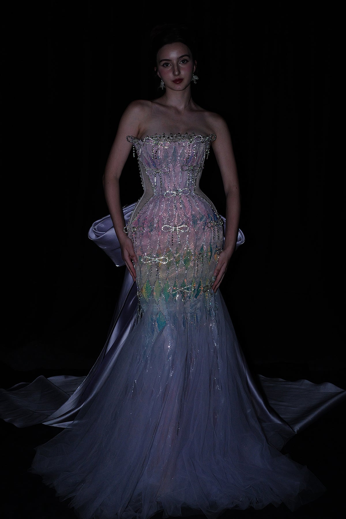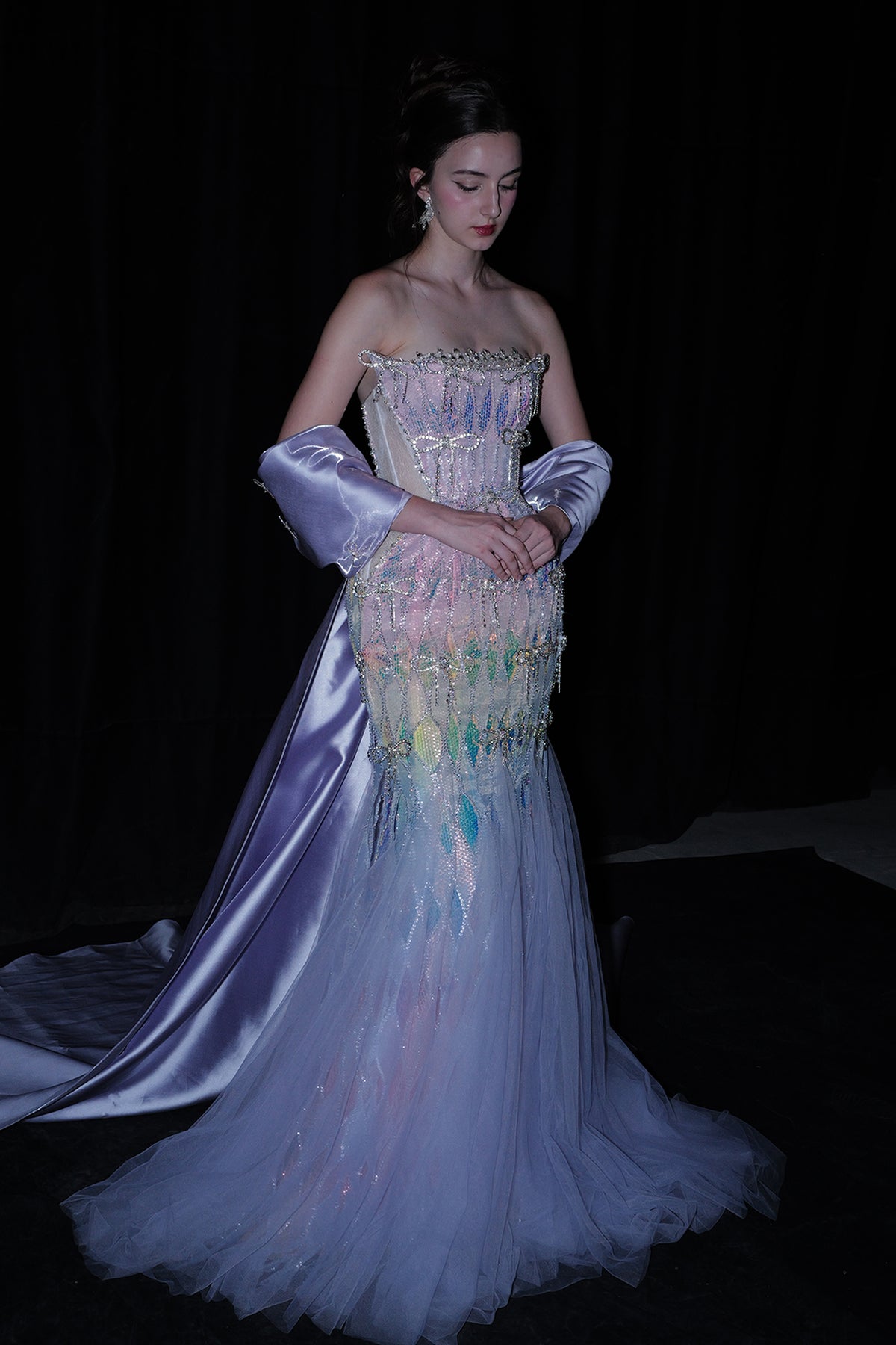 Lilac mermaid long dress. Featuring a strapless neckline structured corset that hugs the ribcage with hidden boning for a sleek. Complemented with bodice tapers to a defined waist and trailing train.