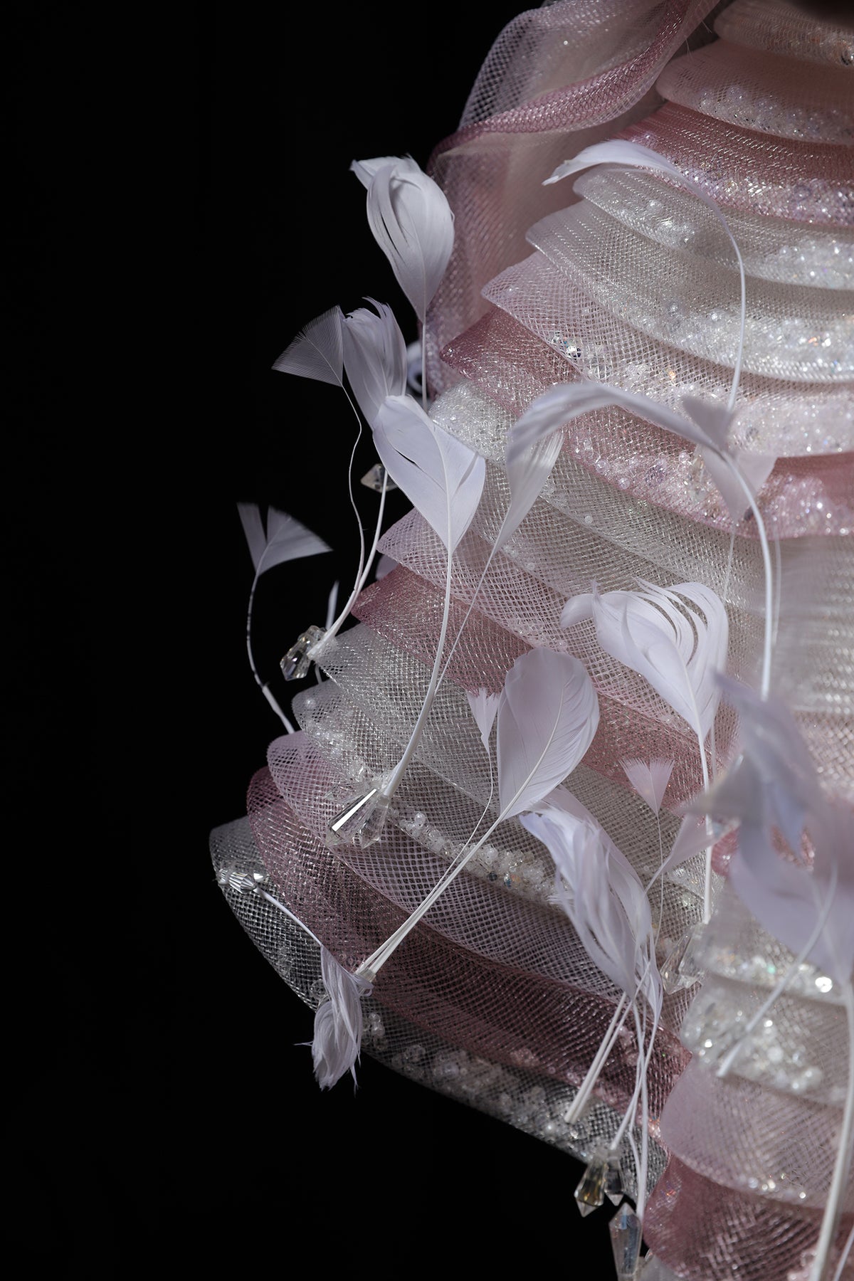 Pale pink short dress. Featuring a strapless tightly fitted corseted bodice with a sweetheart neckline that hugs the torso through the waist. Complemented with a multi-layered short tutu skirt composed of sheer tiered ruffles and subtle sparkle. Completed with lightly adorned with subtle beading or shimmer to catch light without overpowering the frothy layers of the skirt.