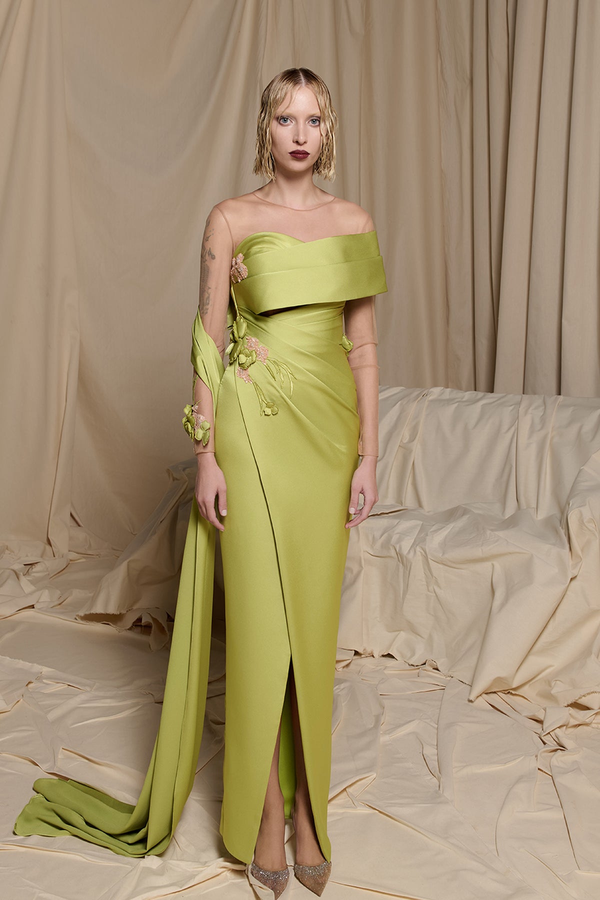 Light green sleek lack column dress. Featuring a soft textured fabric designed to sculpt the body with strapless bodice rises into petal folds lined in vivid fuchsia with the neckline like a blooming flower. Complemented with a back clean line with a discreet slit.