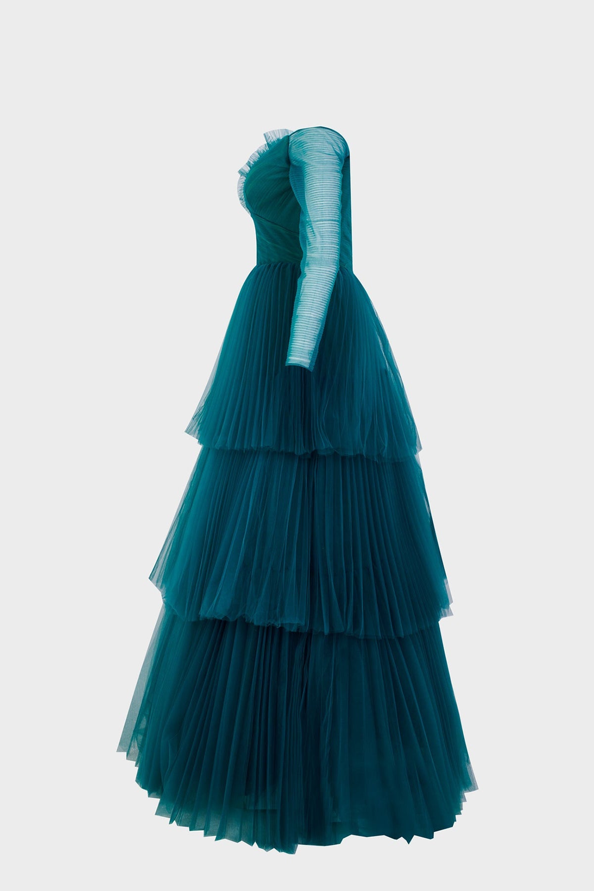 Black tulle long dress. Featuring a V-neckline, flared silhouette with ruffles, sleeves, and a strapless embroidery on the bust. Complemented with a strapless element would conflict, so you may want to choose either sleeves or strapless.