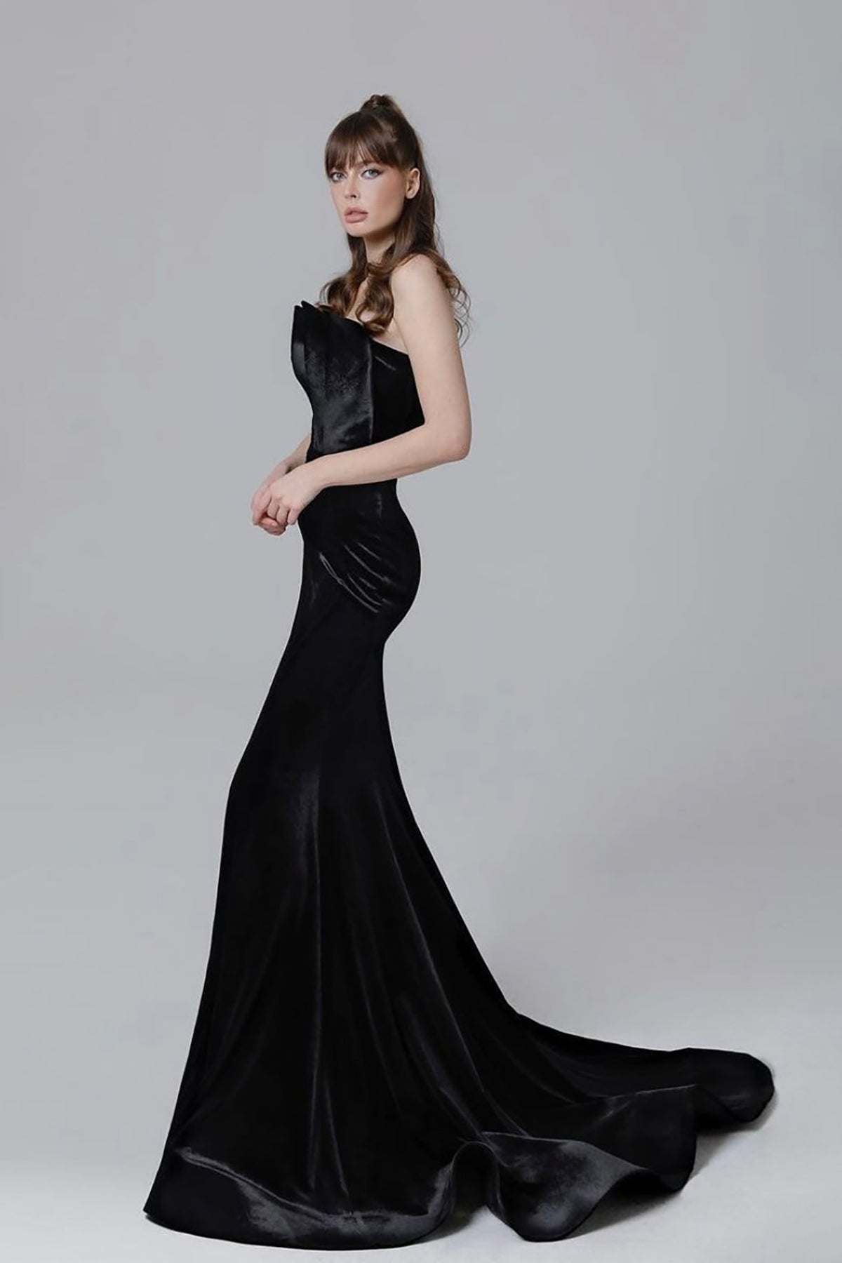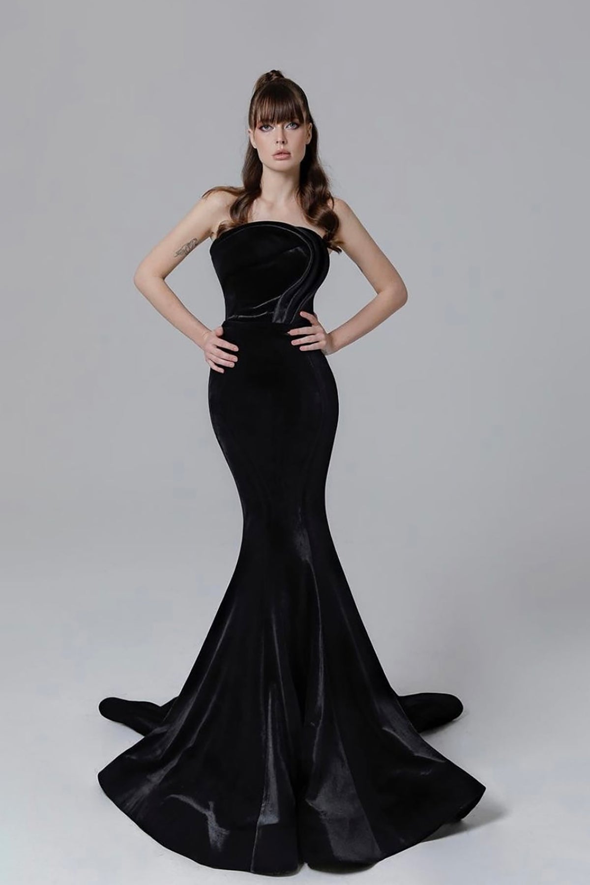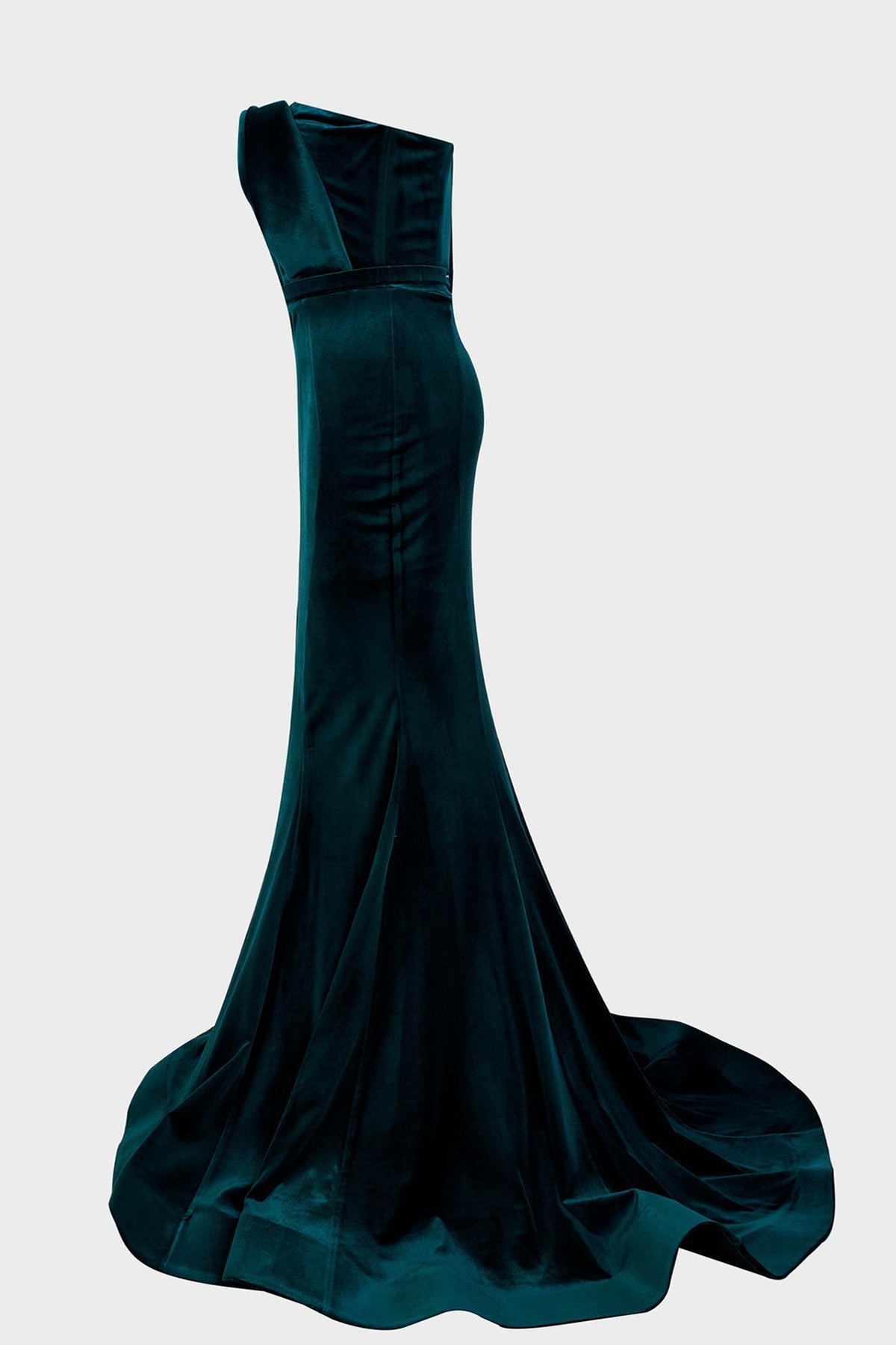 Petrol velvet dress. Featuring a long with a mermaid lower cut a draped bust and fits the body.