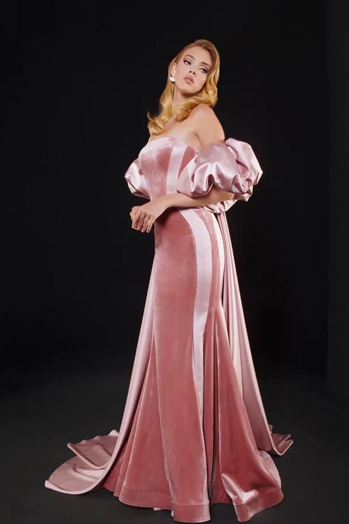 Pink velvet mermaid dress. Featuring satin silk long and strapless with a lower-cut that fits at the waist. Complemented with a puffed detached sleeves connected to a tail.