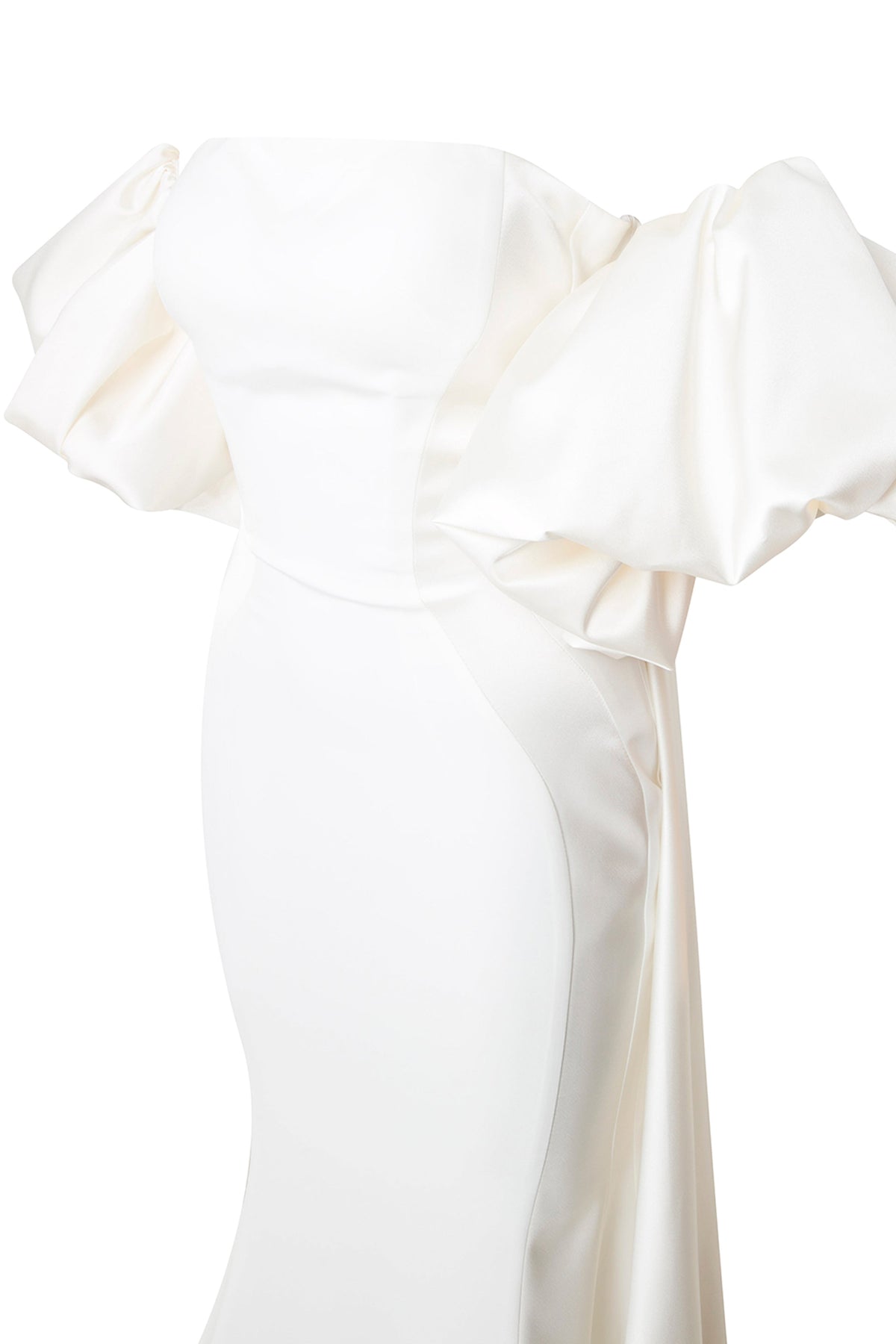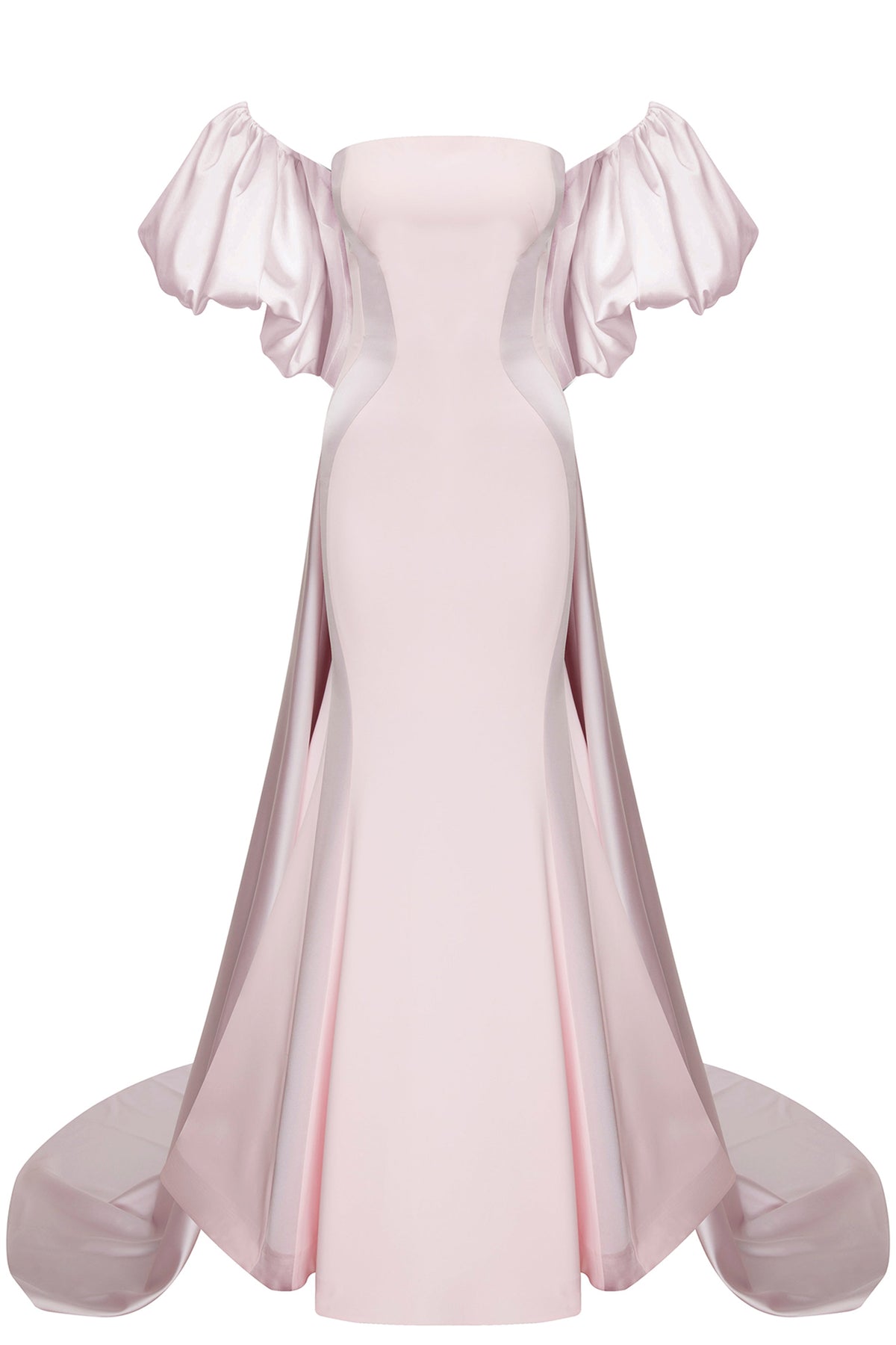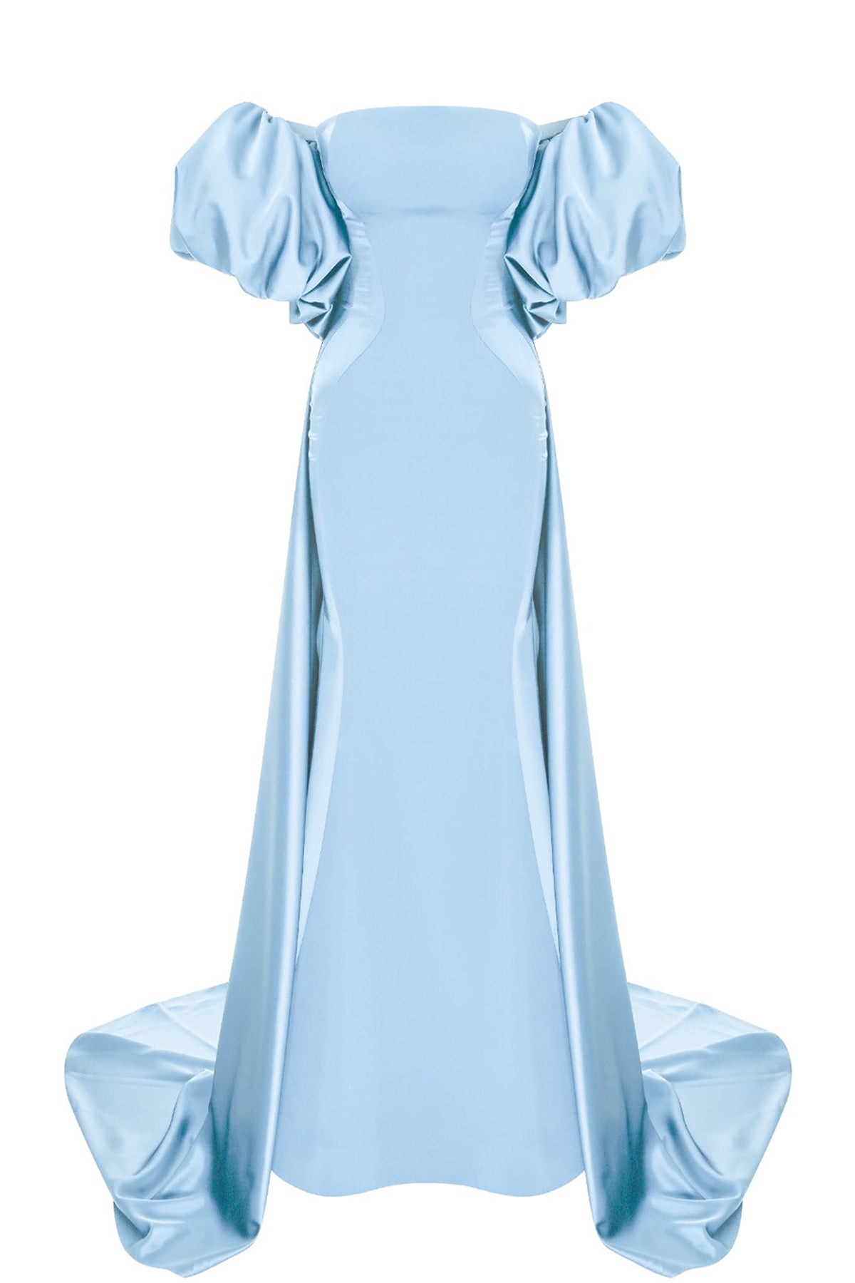 Royal blue crepe with satin-silk long dress. Featuring a strapless with a mermaid lower cut and a tail bounded to the off-the-shoulder detached sleeves.