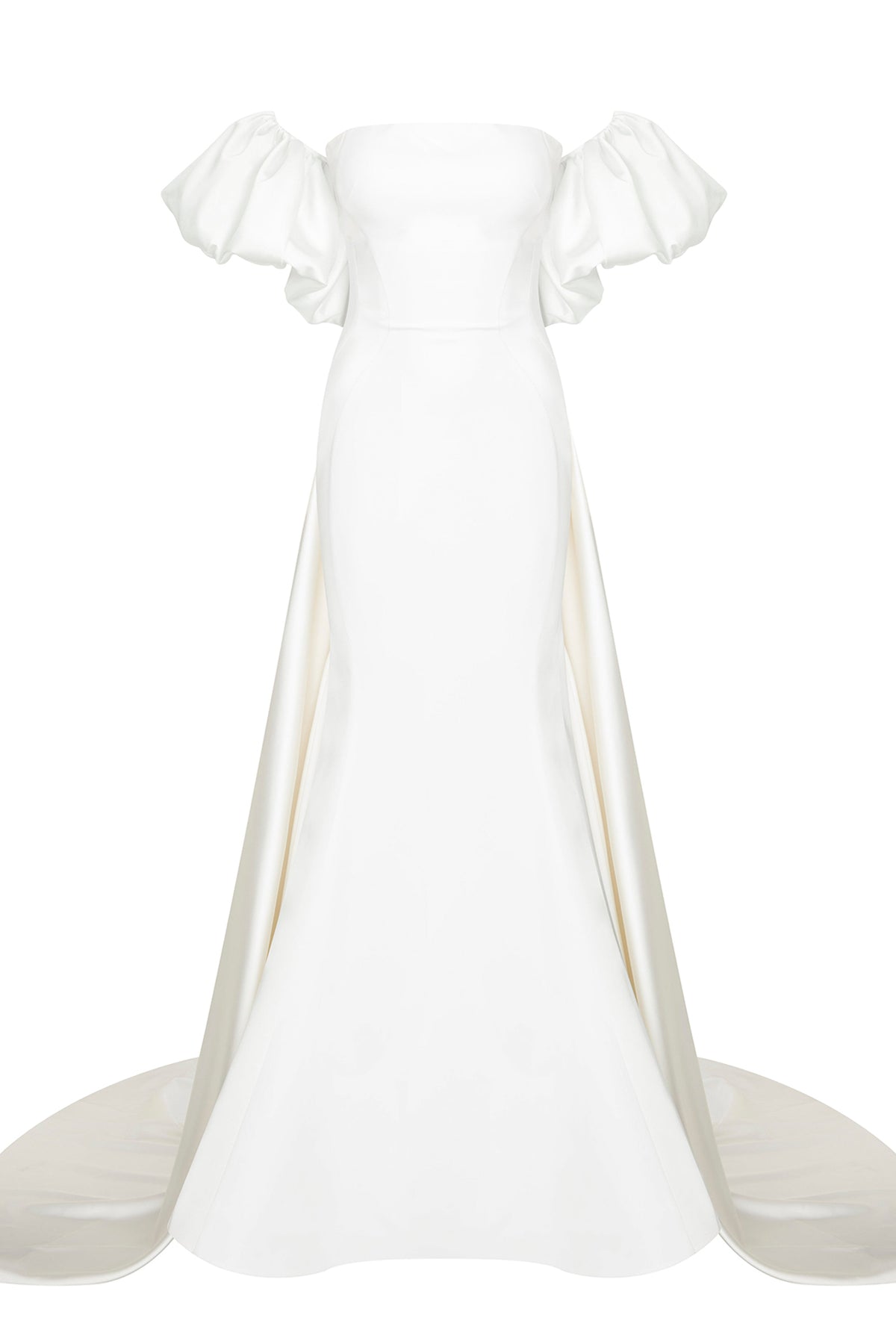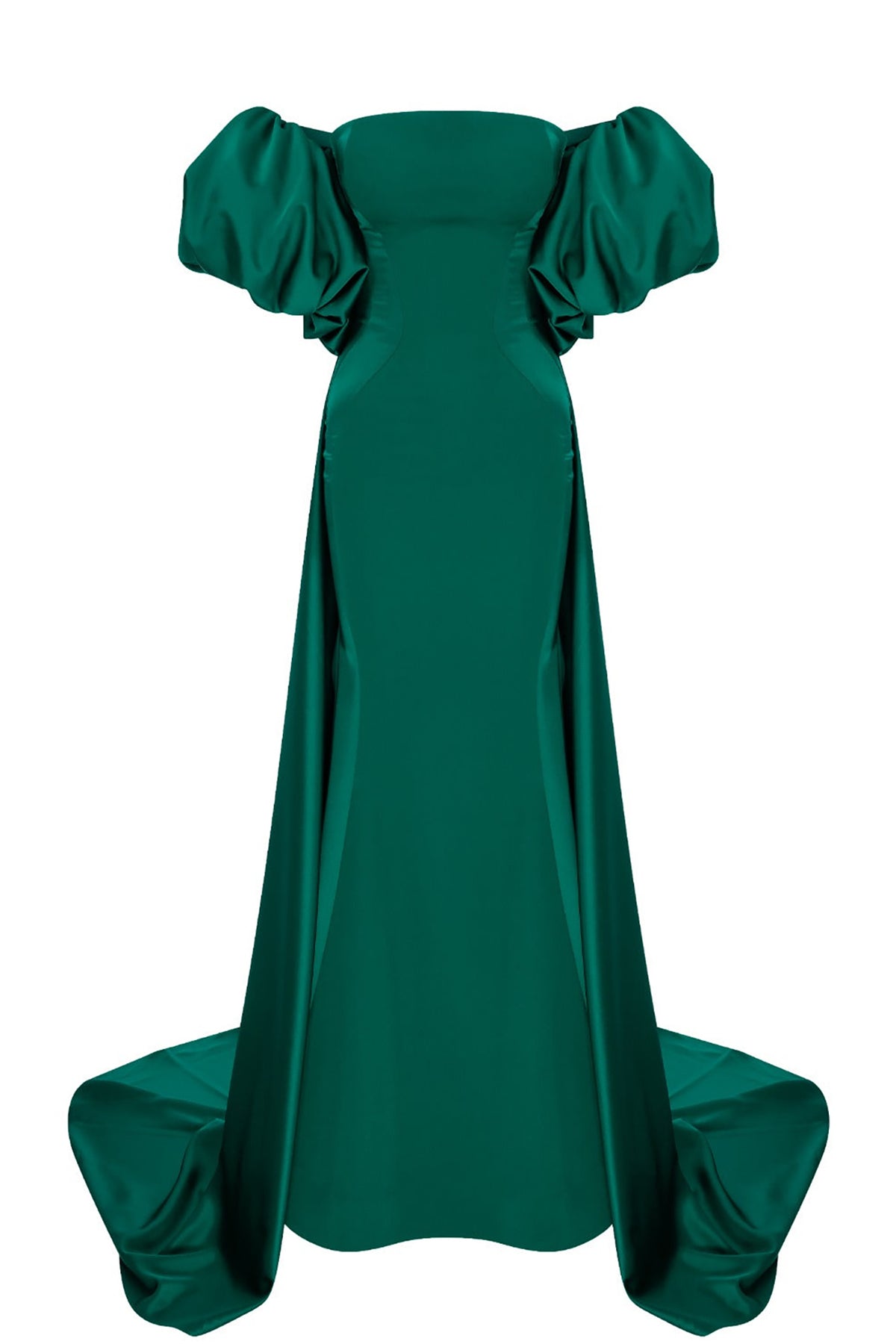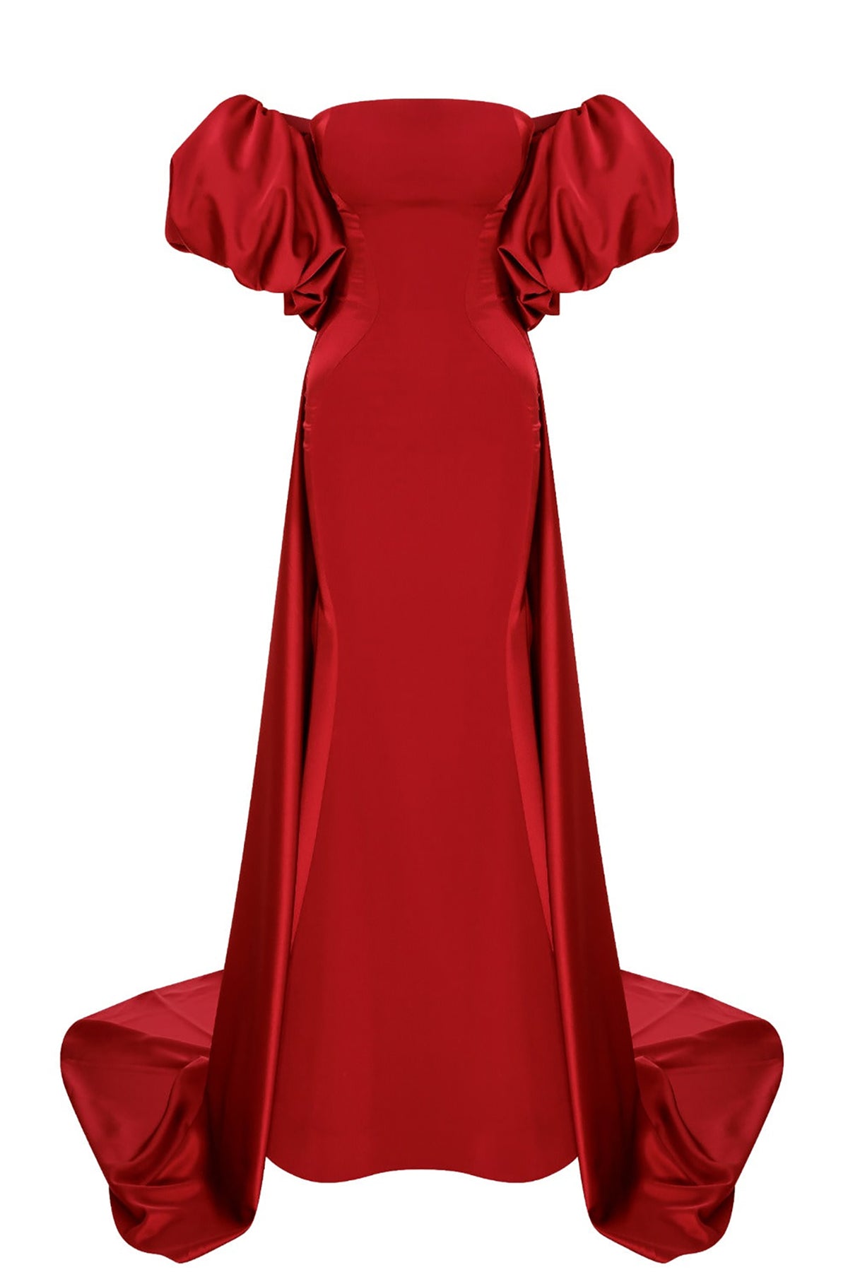 Royal blue crepe with satin-silk long dress. Featuring a strapless with a mermaid lower cut and a tail bounded to the off-the-shoulder detached sleeves.