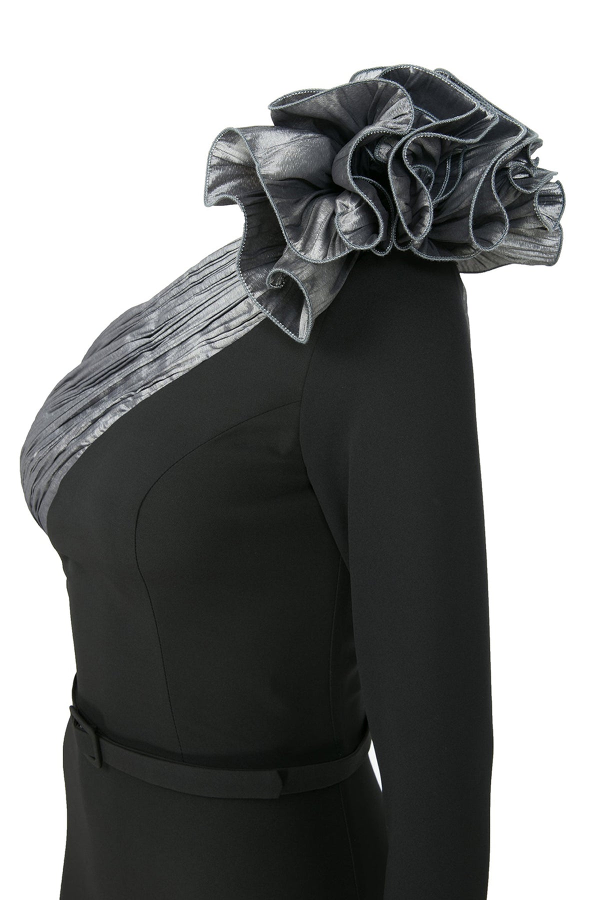 Black and purple crepe with tafta dress. Featuring an asymmetrical upper-neck cut with a roman classic lower cut embellished with pleats on the bust and a flower on the shoulder. Complemented by a toka belt and including one single-sided long sleeve with a detached sleeve.