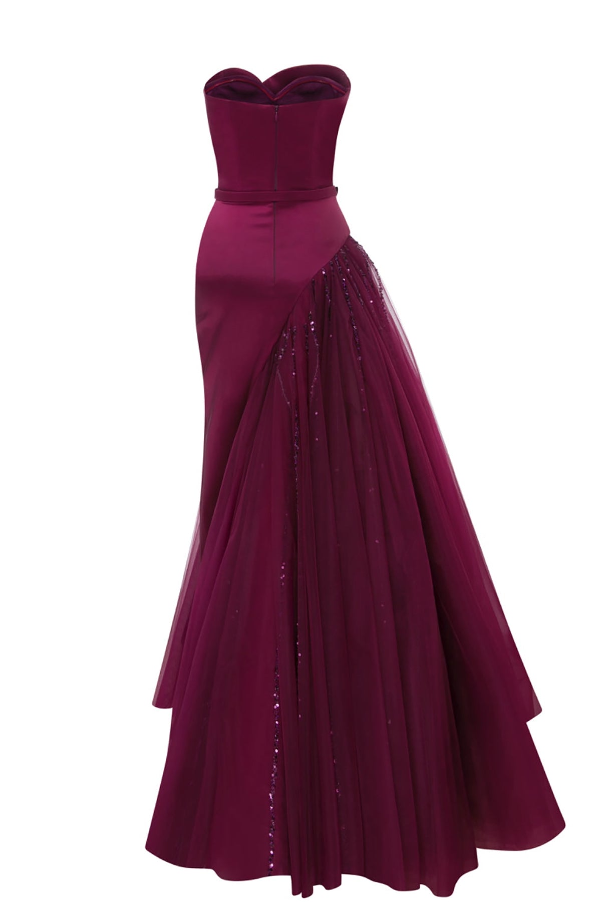 Emerald green satin with tulle beaded fabric dress. Featuring a strapless with a heart-shaped bust that includes a belt. Complemented with a fish-tail lower cut and is embellished with tassels on the skirt.