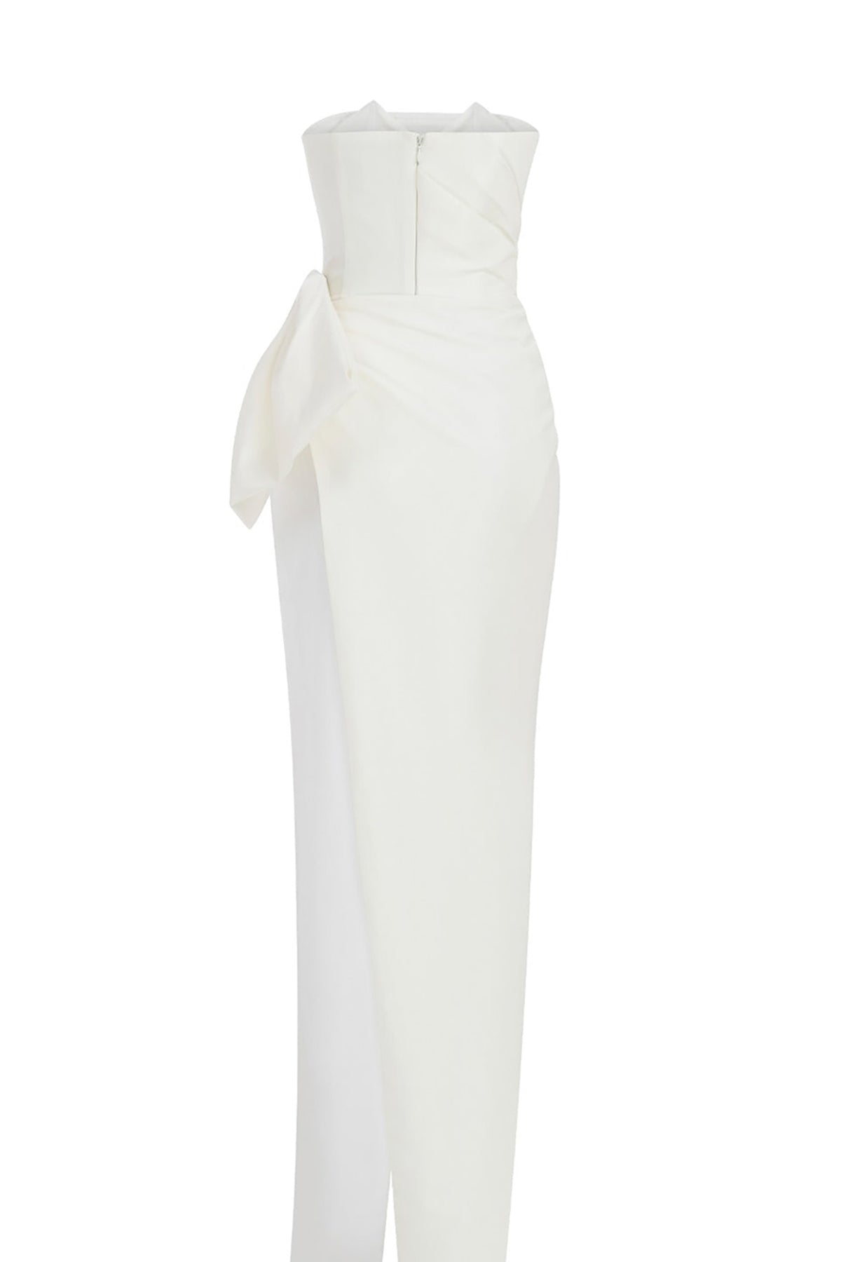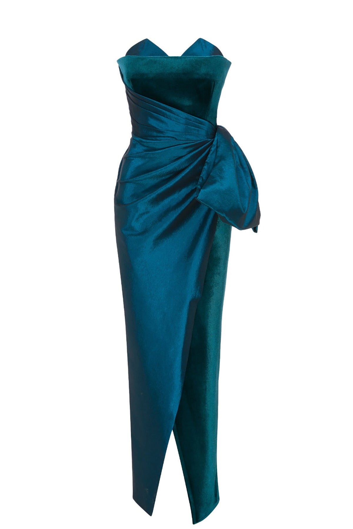 Cherry velvet and tafta dress. Featuring a strapless Roman classic skirt, a corset, two long gloves. Complemented with a tie-shaped drape at the waist.