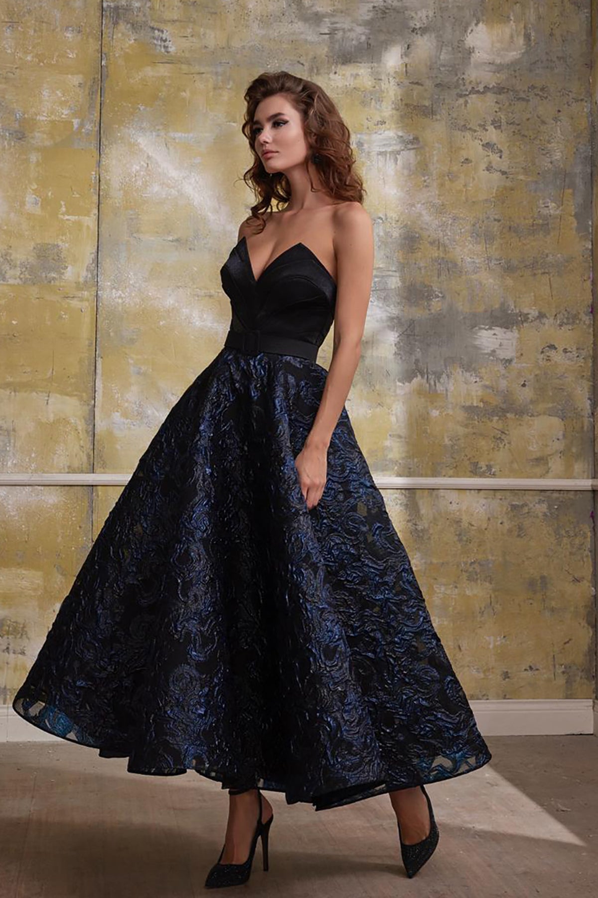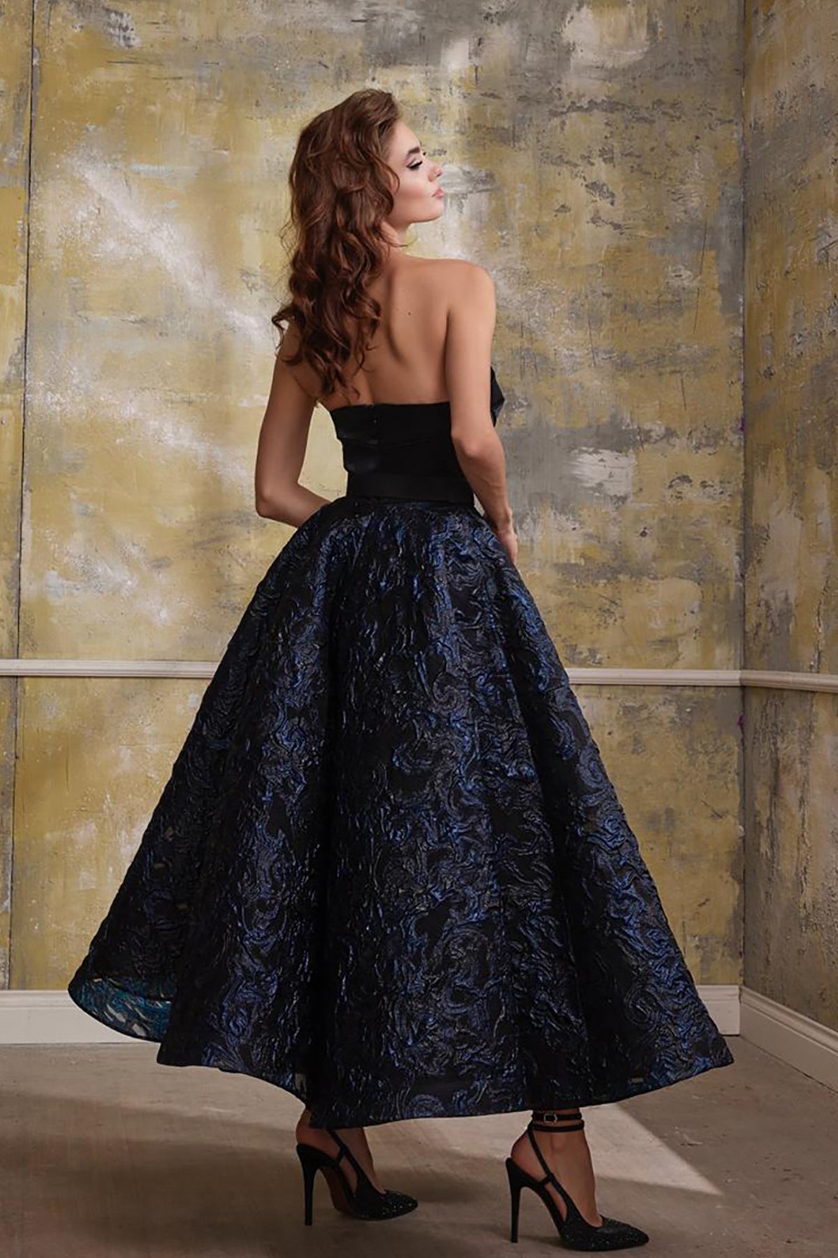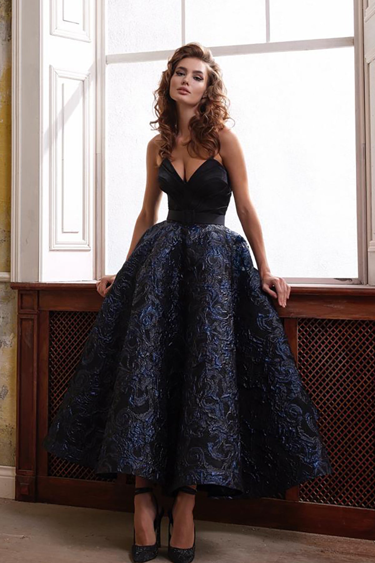 Black a-line midi dress. Featuring a strapless sweetheart neckline corset bodice that cinches at the waist. Complemented with oversized, puffed, and sculpted into poofy bell shapes that attach at the upper arm, creating a striking contrast to the fitted waist and the so-called “petite” bodice. Completed floor-length with a generous.