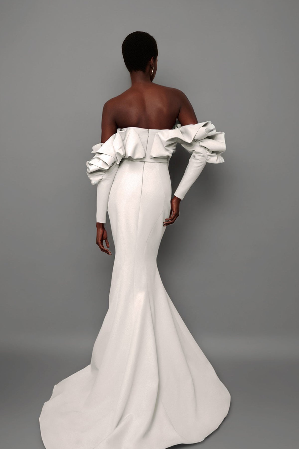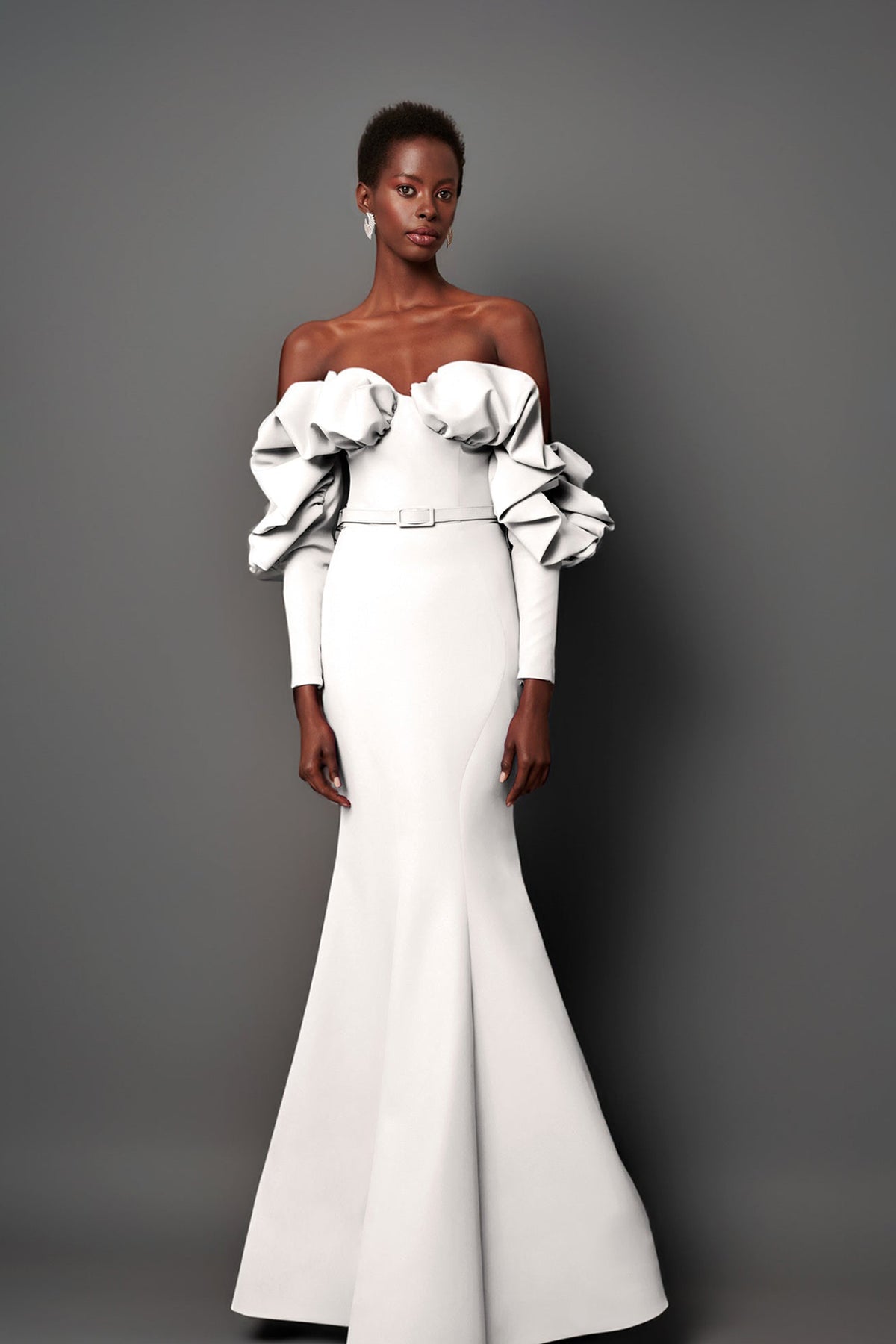 White sleeved off-the-shoulder French crepe dress. Featuring a thin belt, a fish-cut skirt embellished with a mid-length tail made from 8% Lycra-based fabric. Complemented with a lined corset and tailored to a well-fitted silhouette.